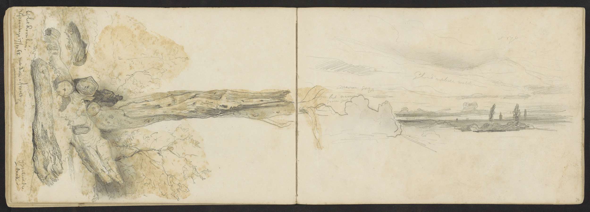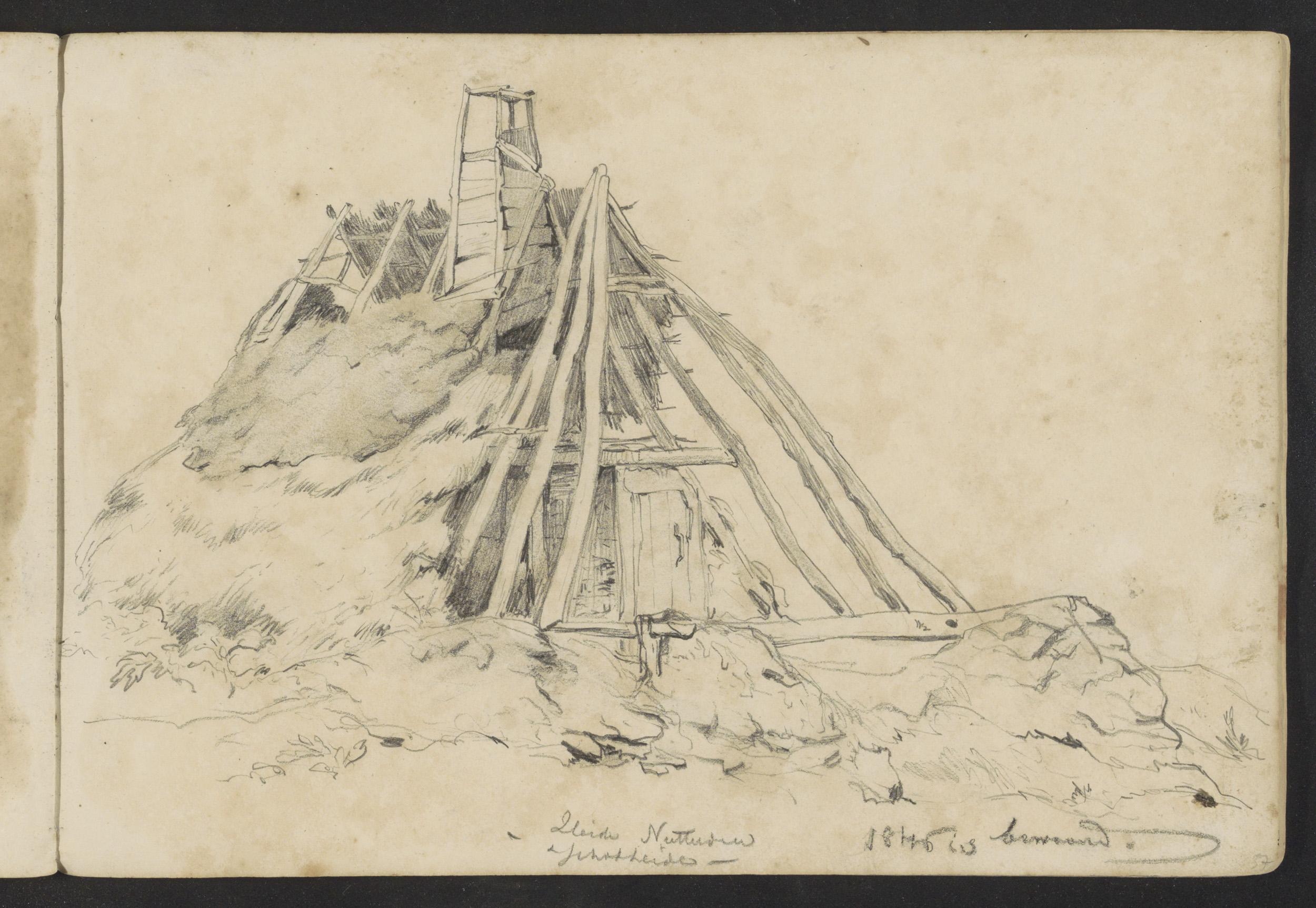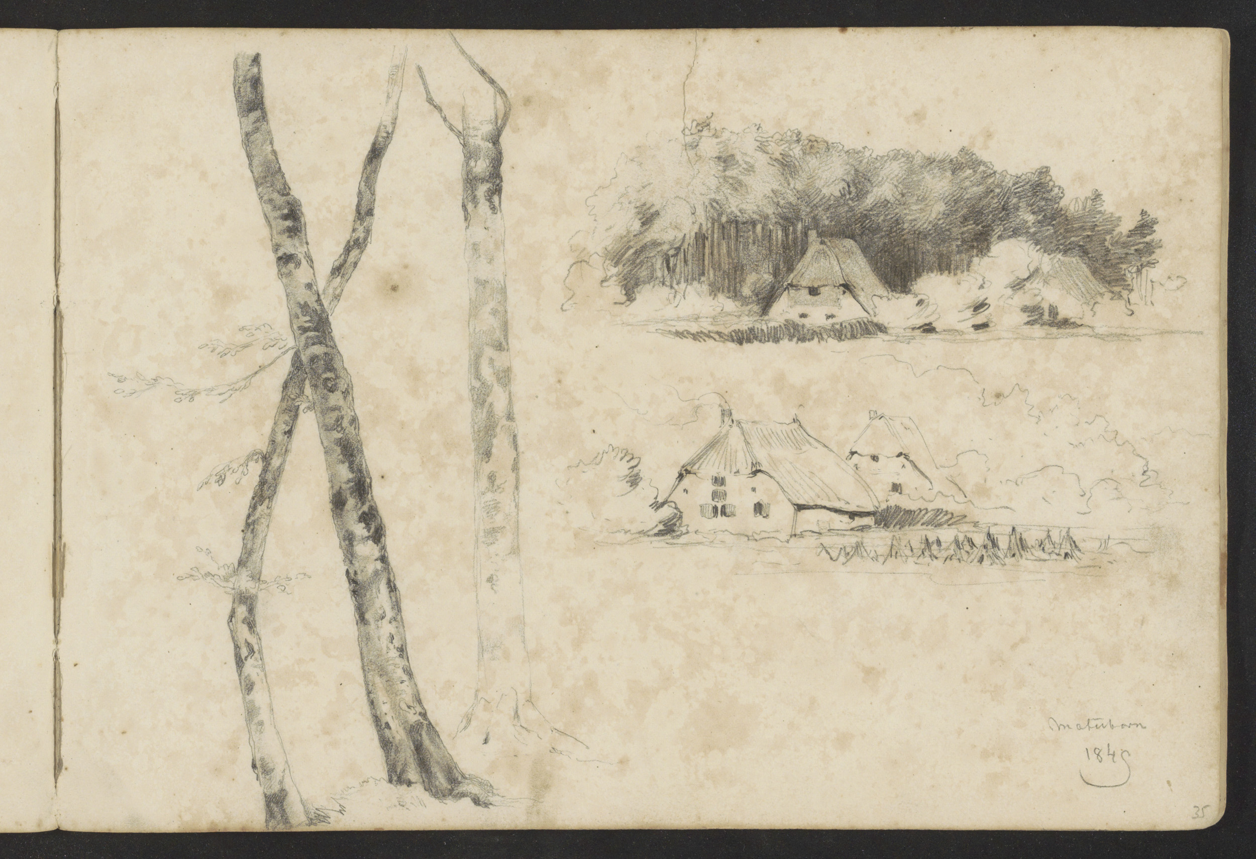 Stammen van berkenbomen en plaggenhutten in Materborn