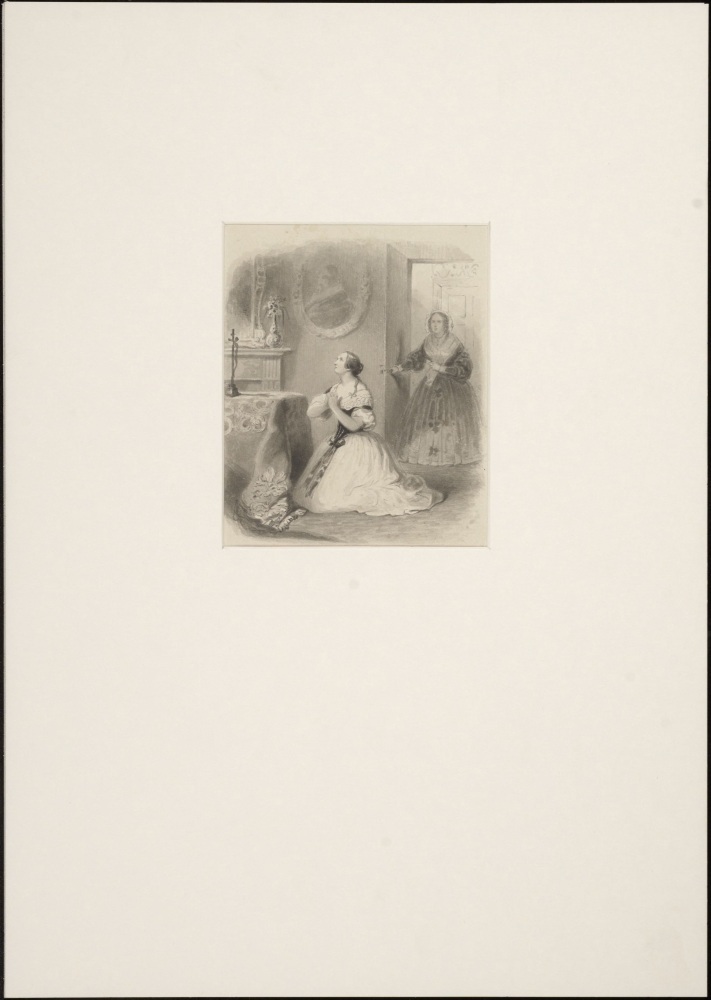 Vrouw knielend voor kruisbeeld