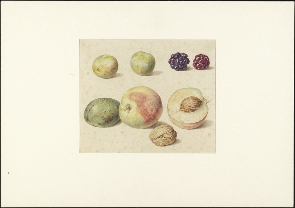 Stilleven met vruchten en tekengereedschap