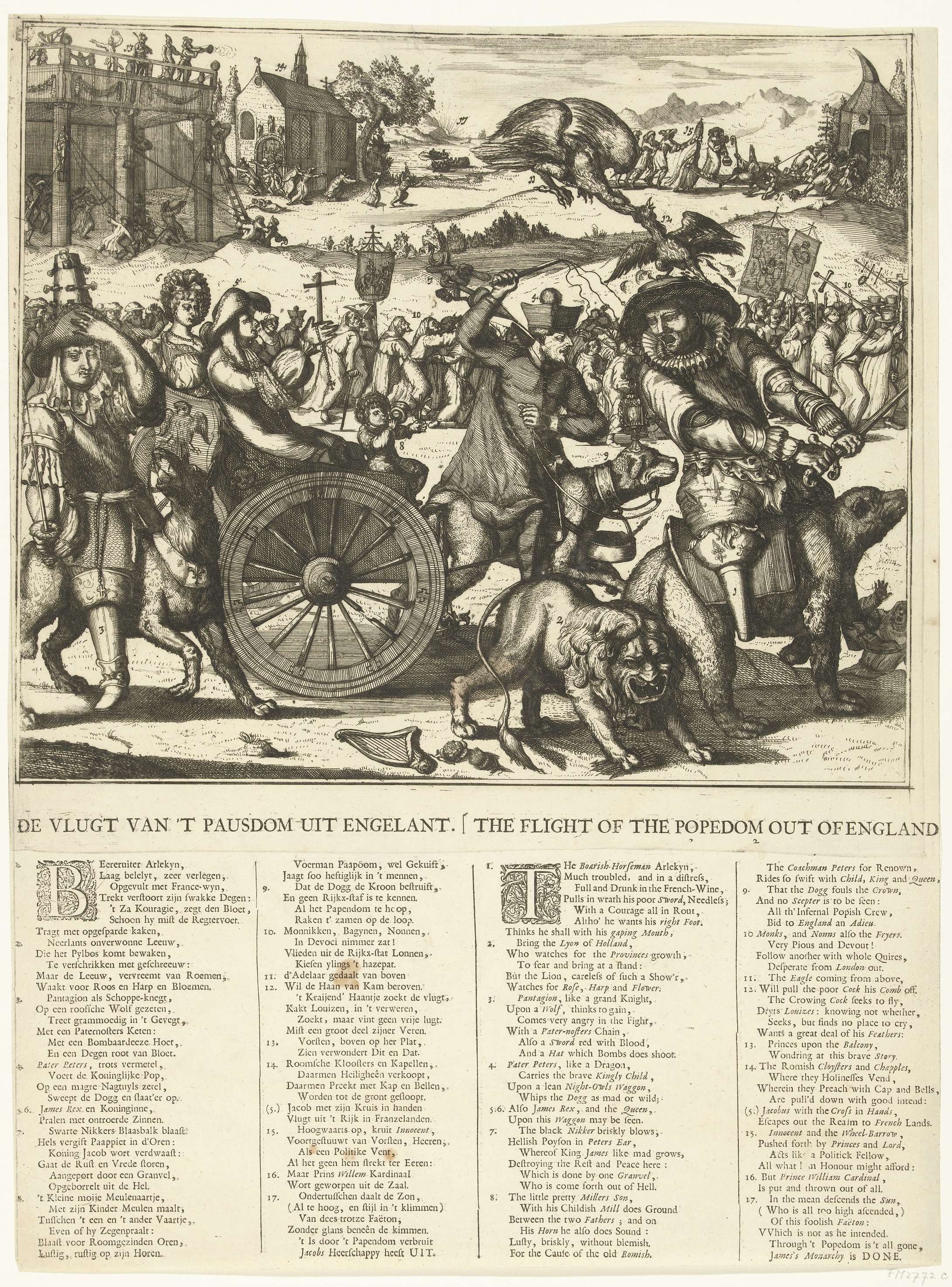 Spotprent op de val van Jacobus II en zijn vlucht na...