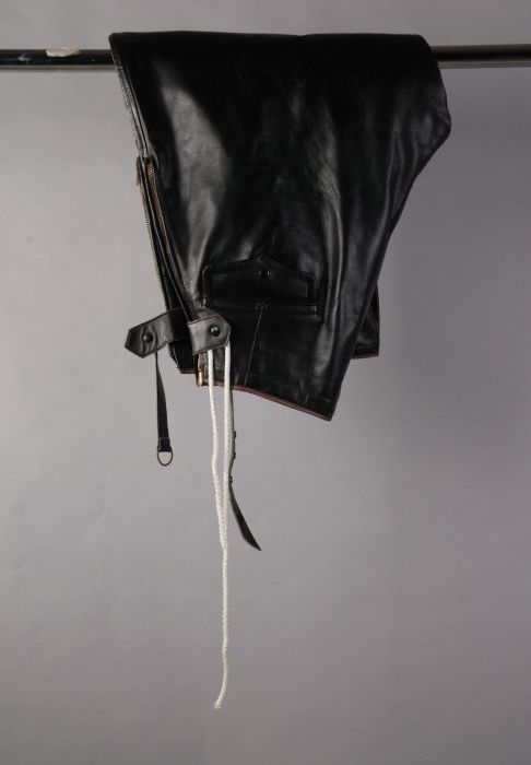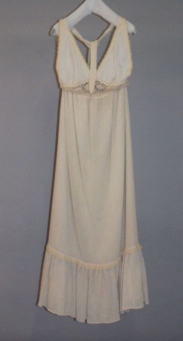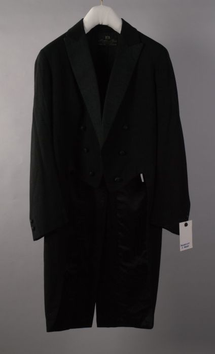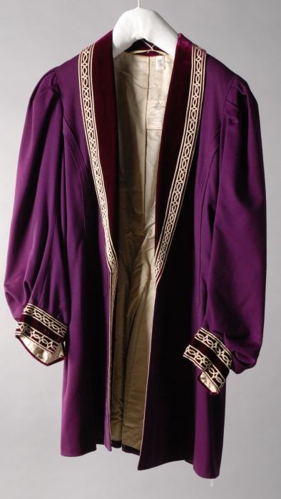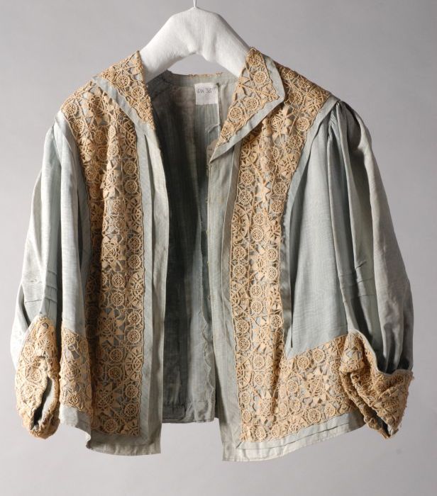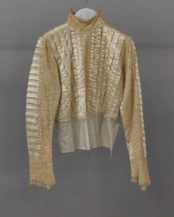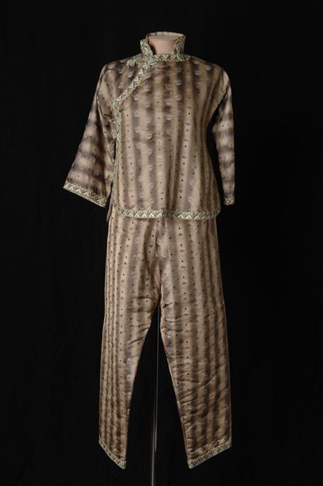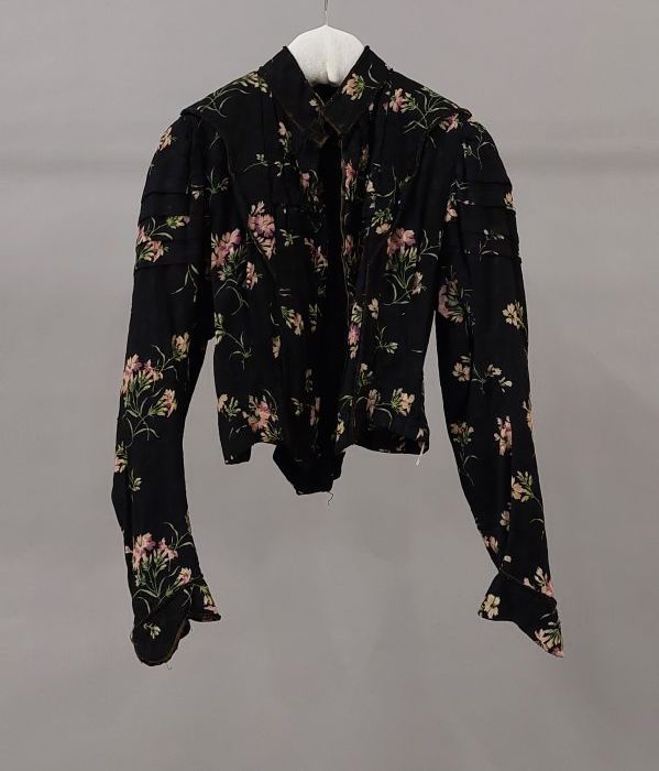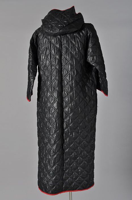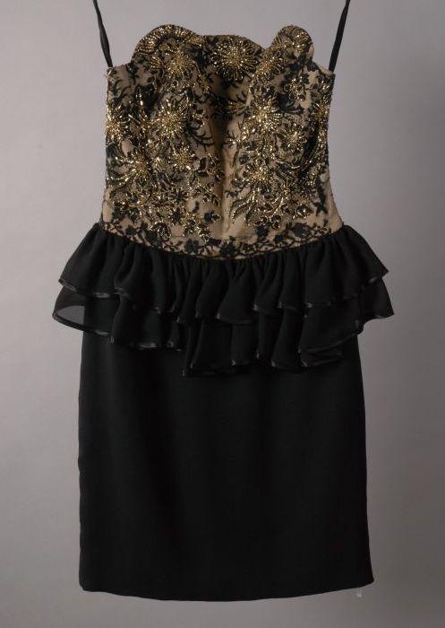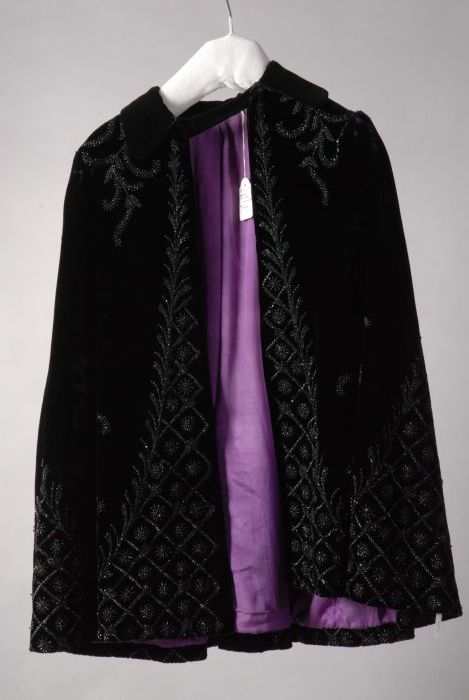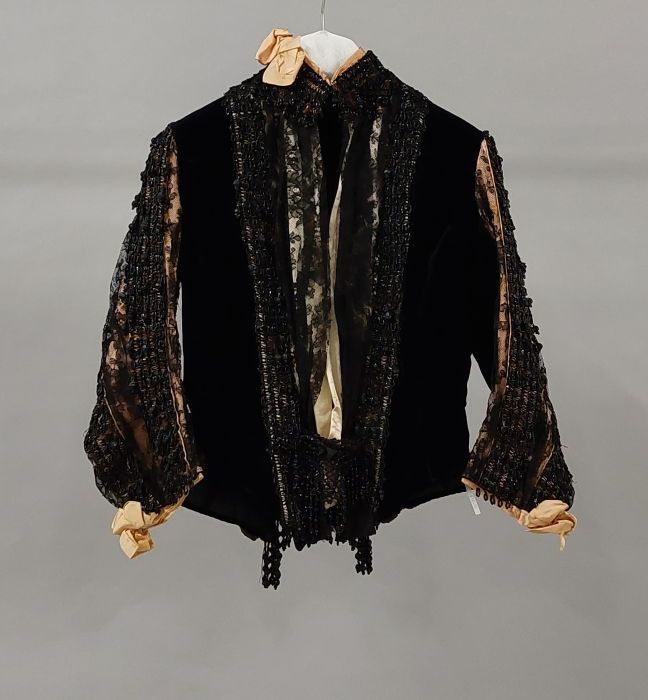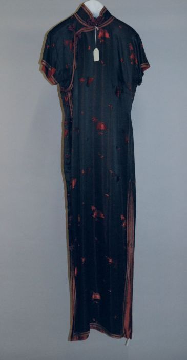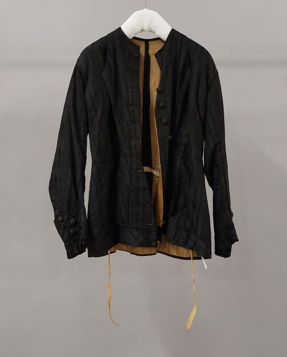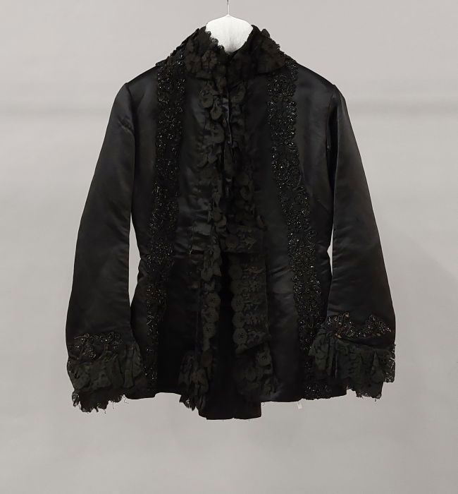 Zwarte zijden avondjapon met opgezette bandjes in ge...