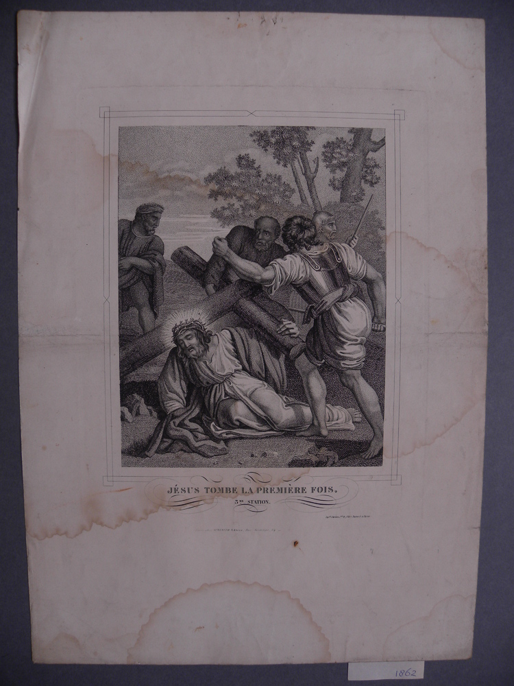 Litho voorstellende derde statie uit de kruisiging v...