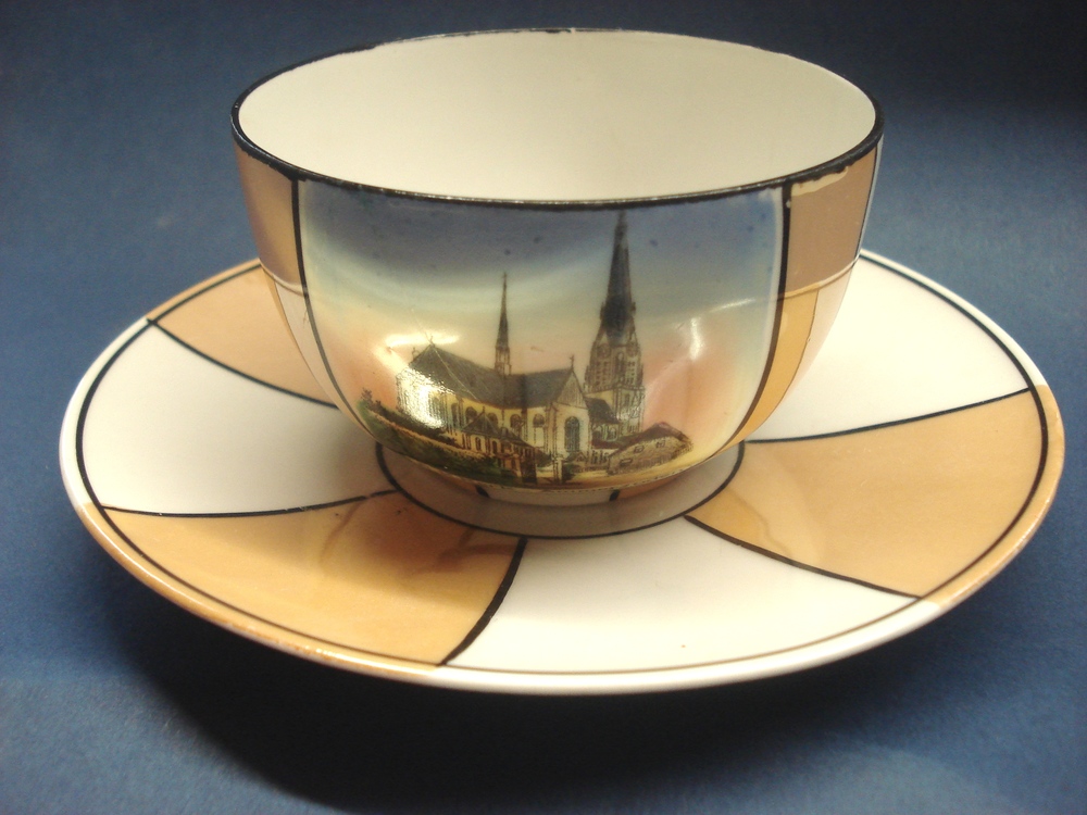 Kop en schotel van porselein met afbeelding van R.K....