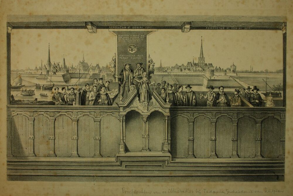 Gravure in lijst en plaat (stempel) met de titel 'Ma...