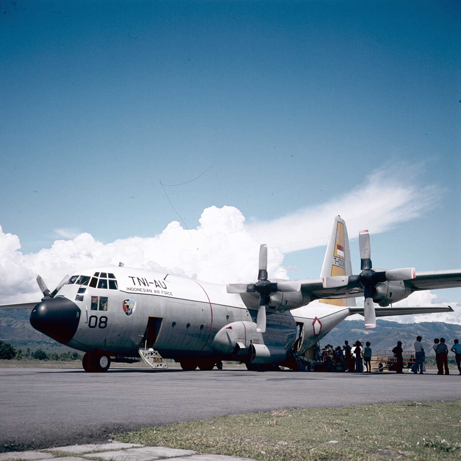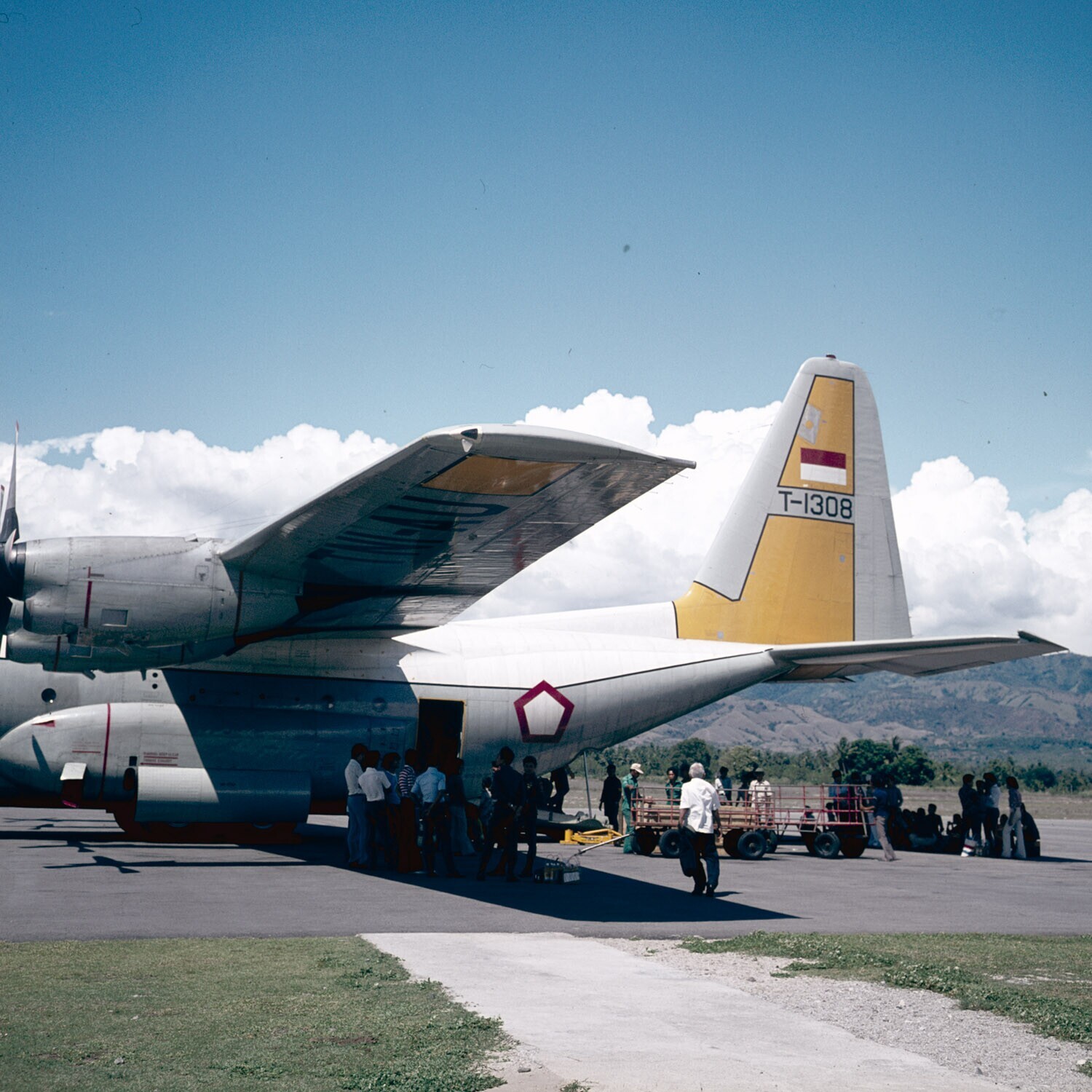Militair vrachtvliegtuig op vliegveld bij Palu, Sula...