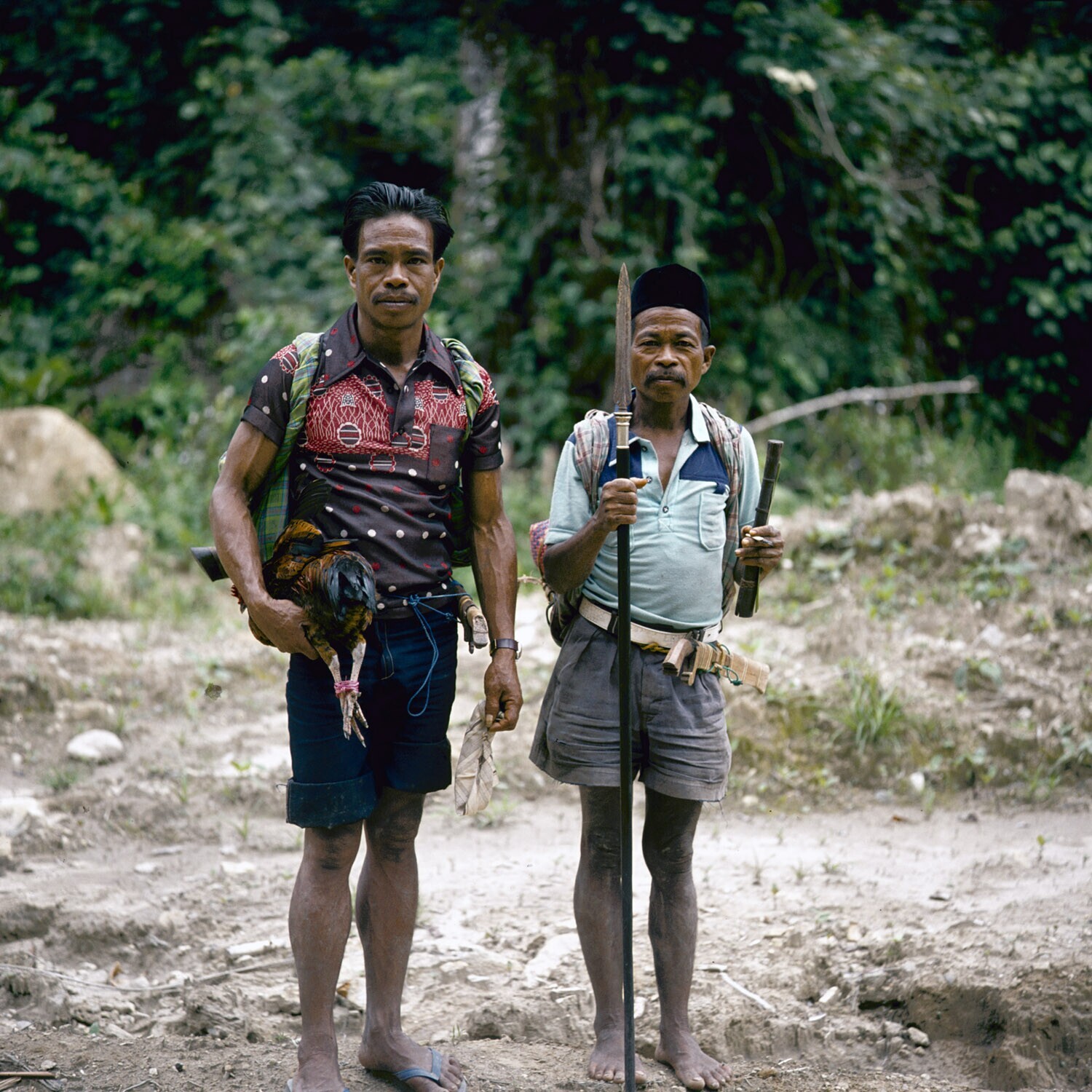 Twee jagers, waarvan één met kip onder de arm, ten z...