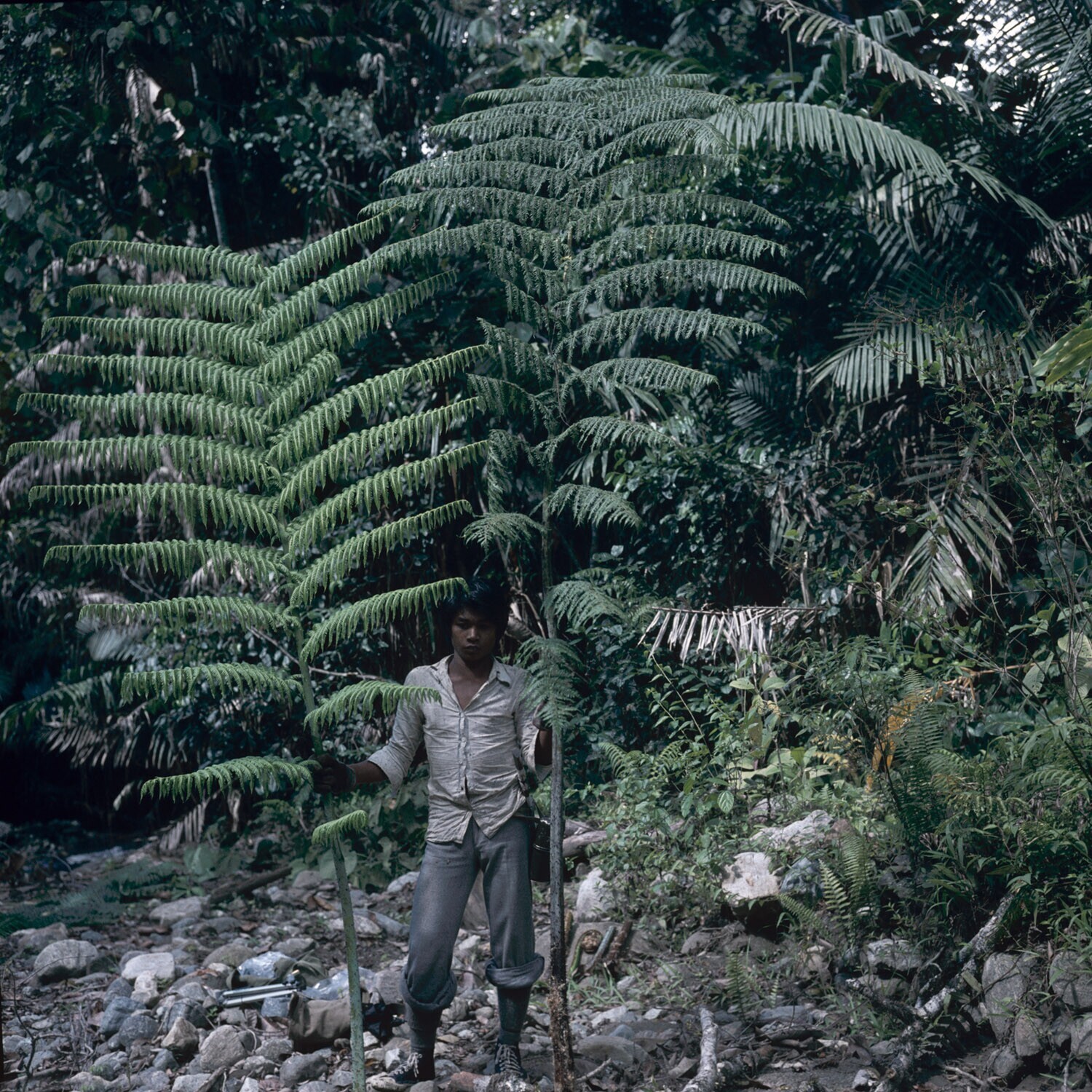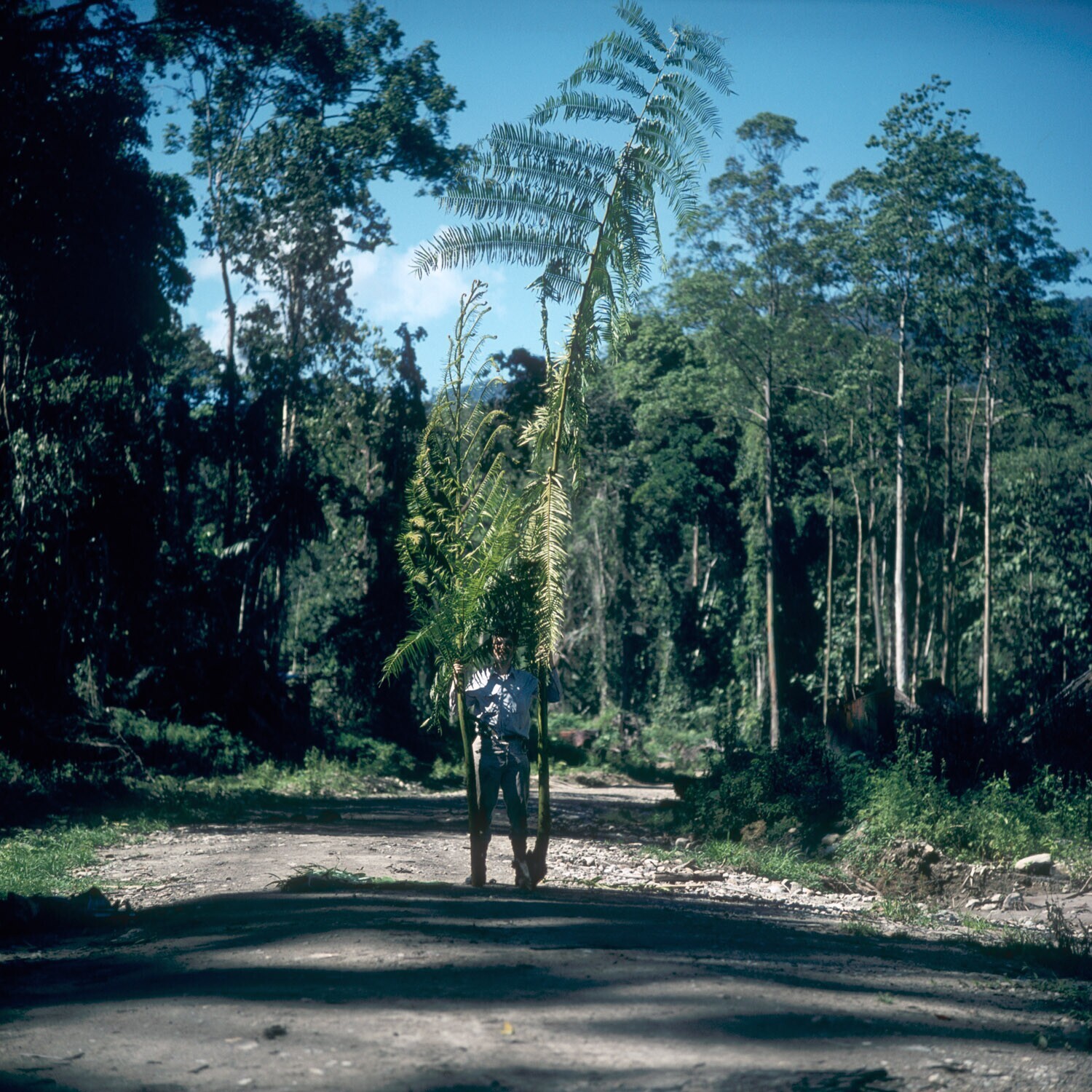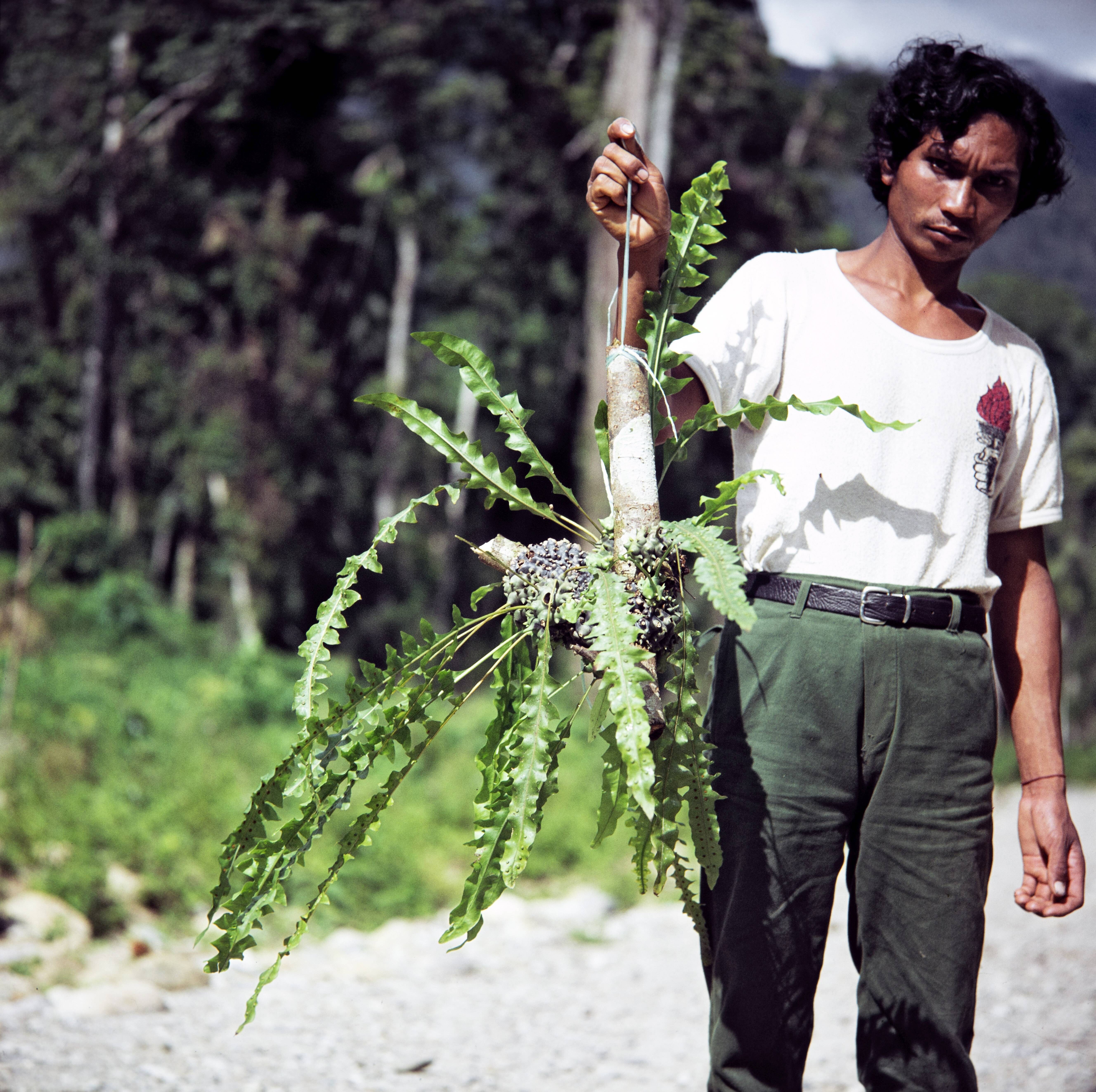 Man met twee takken van een boomvaren (mogelijk Spha...
