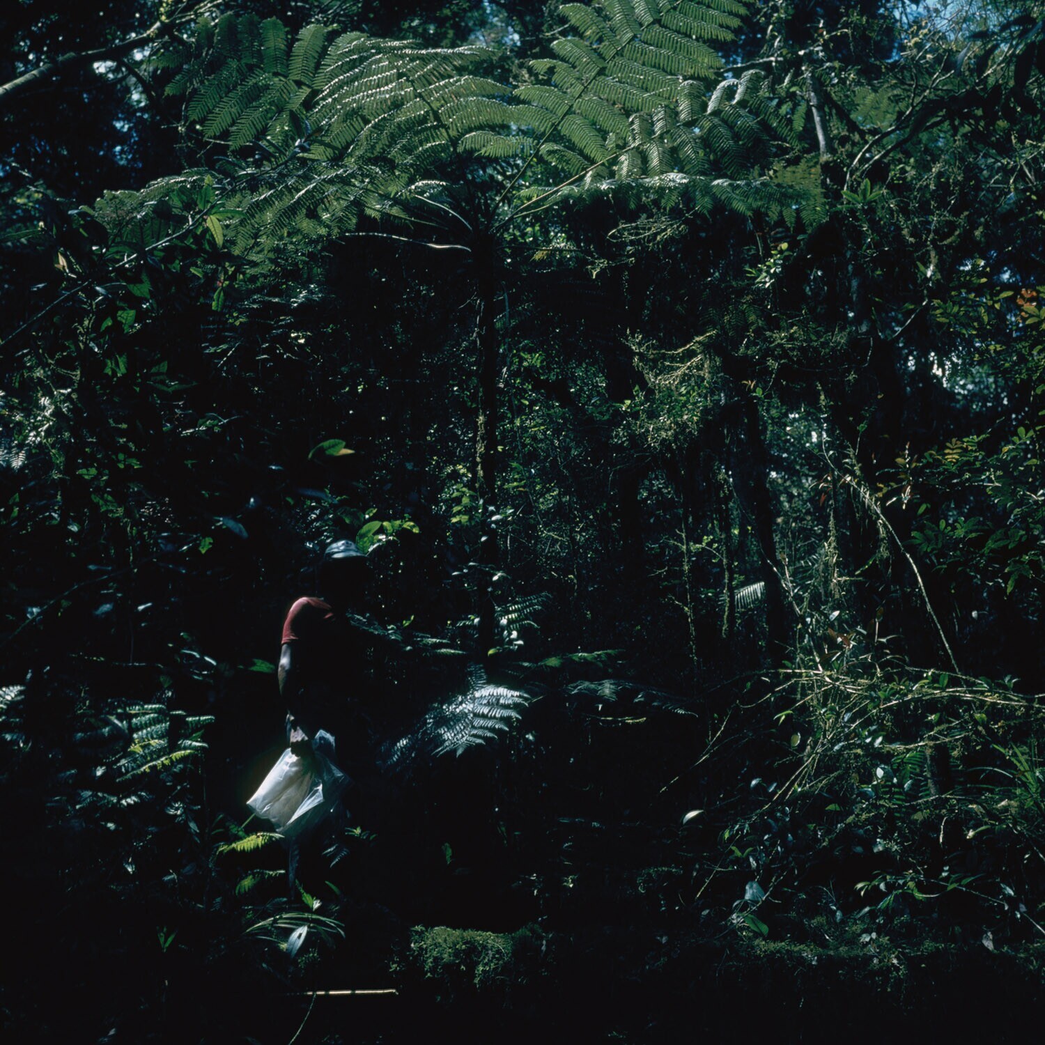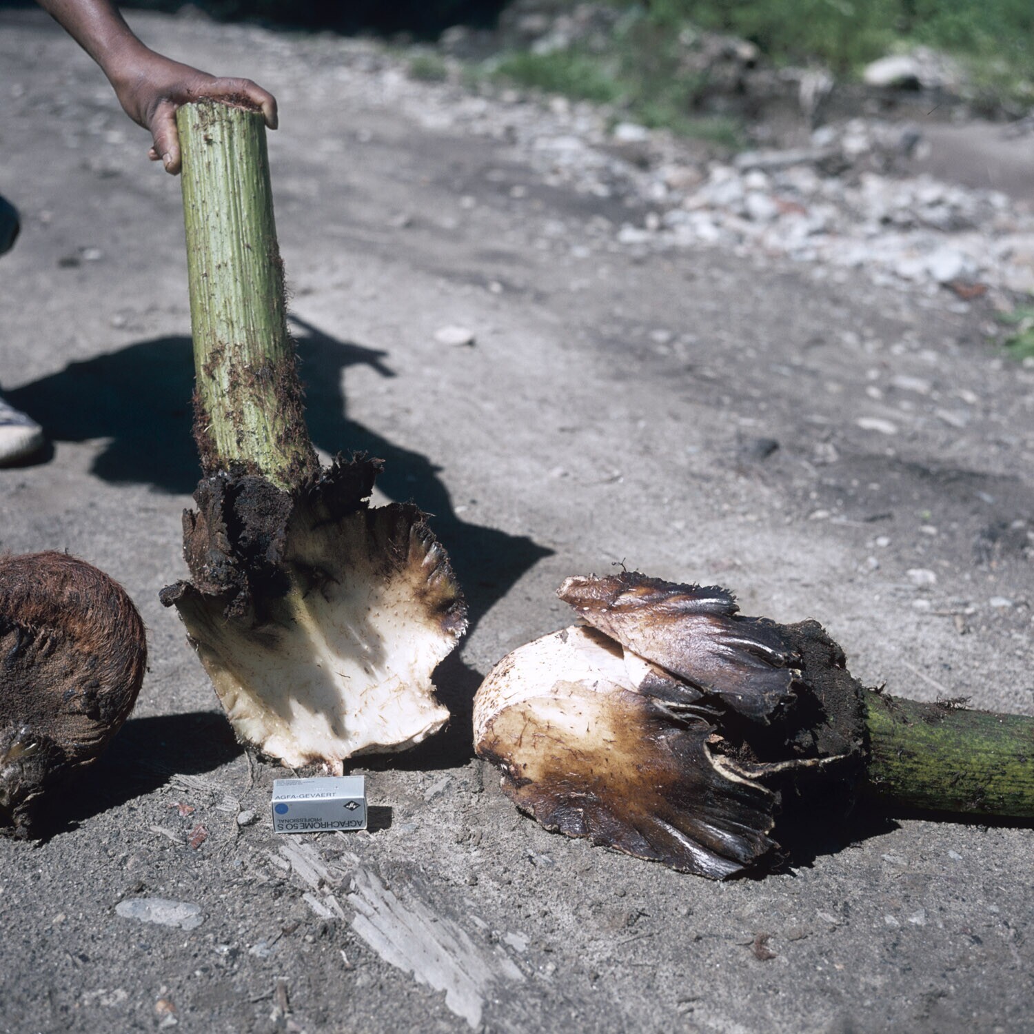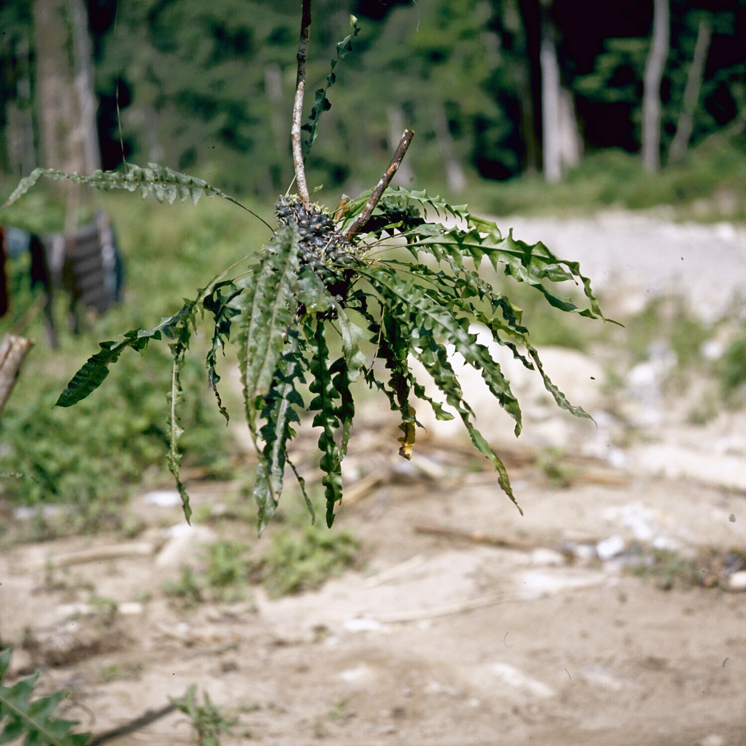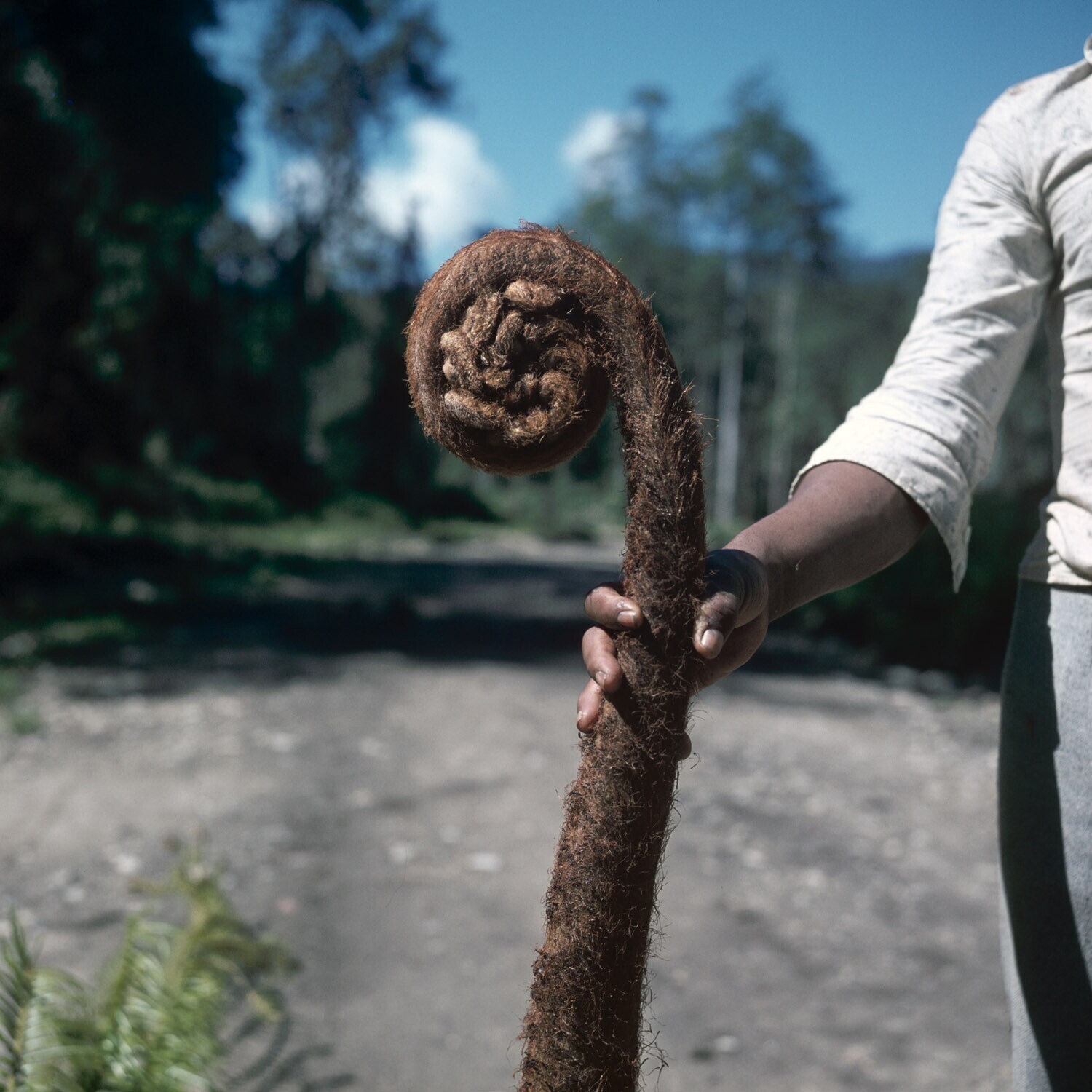 Man met twee takken van een boomvaren (mogelijk Spha...