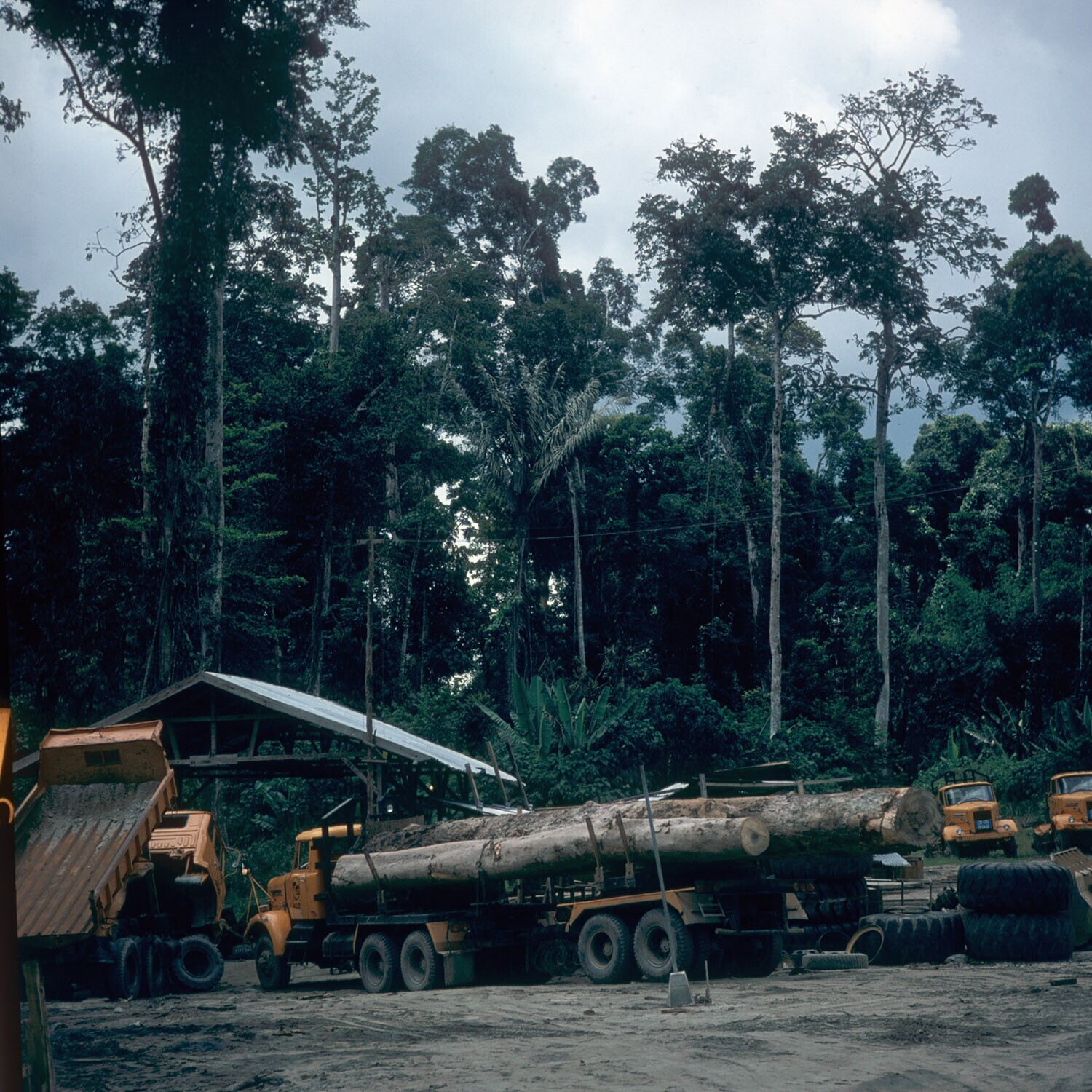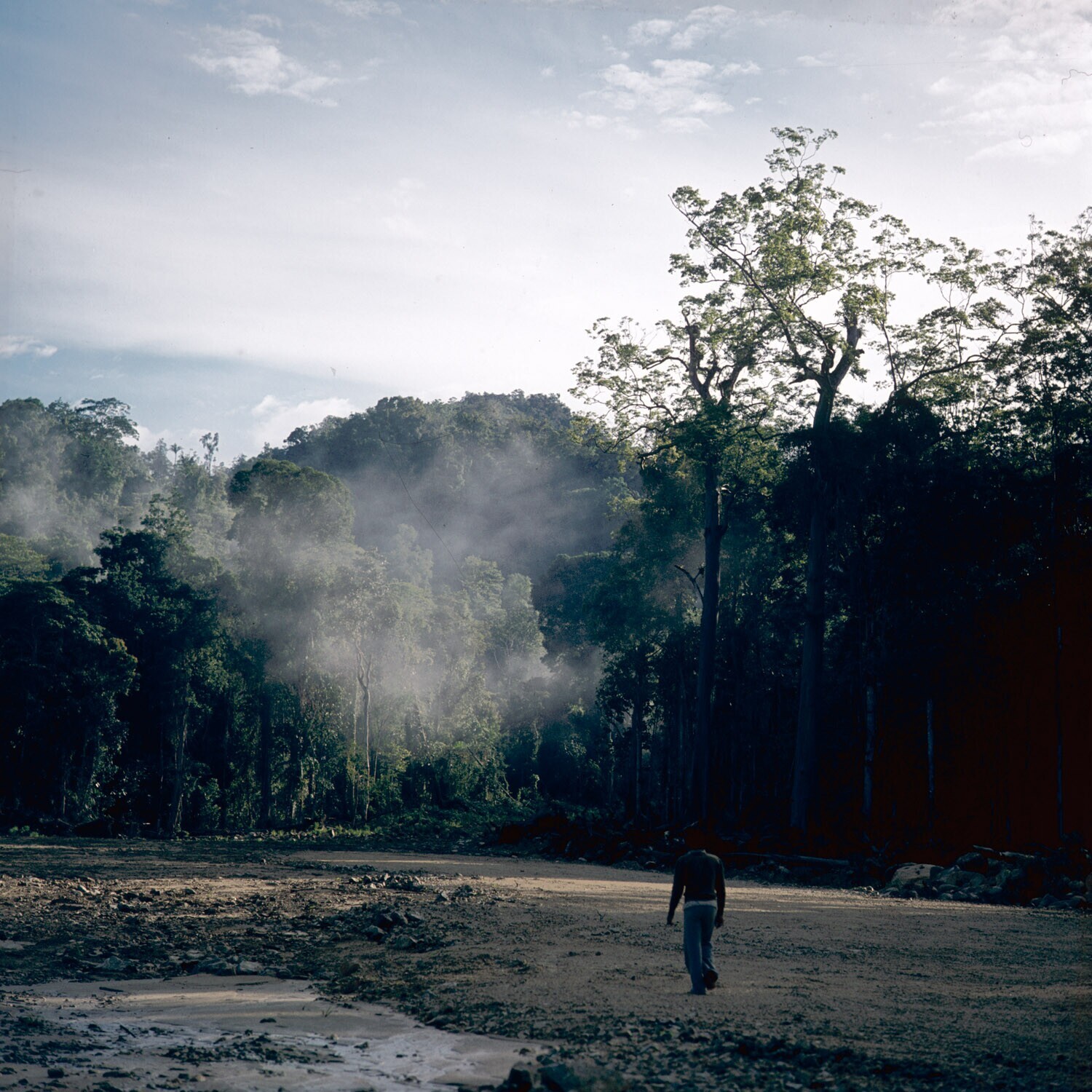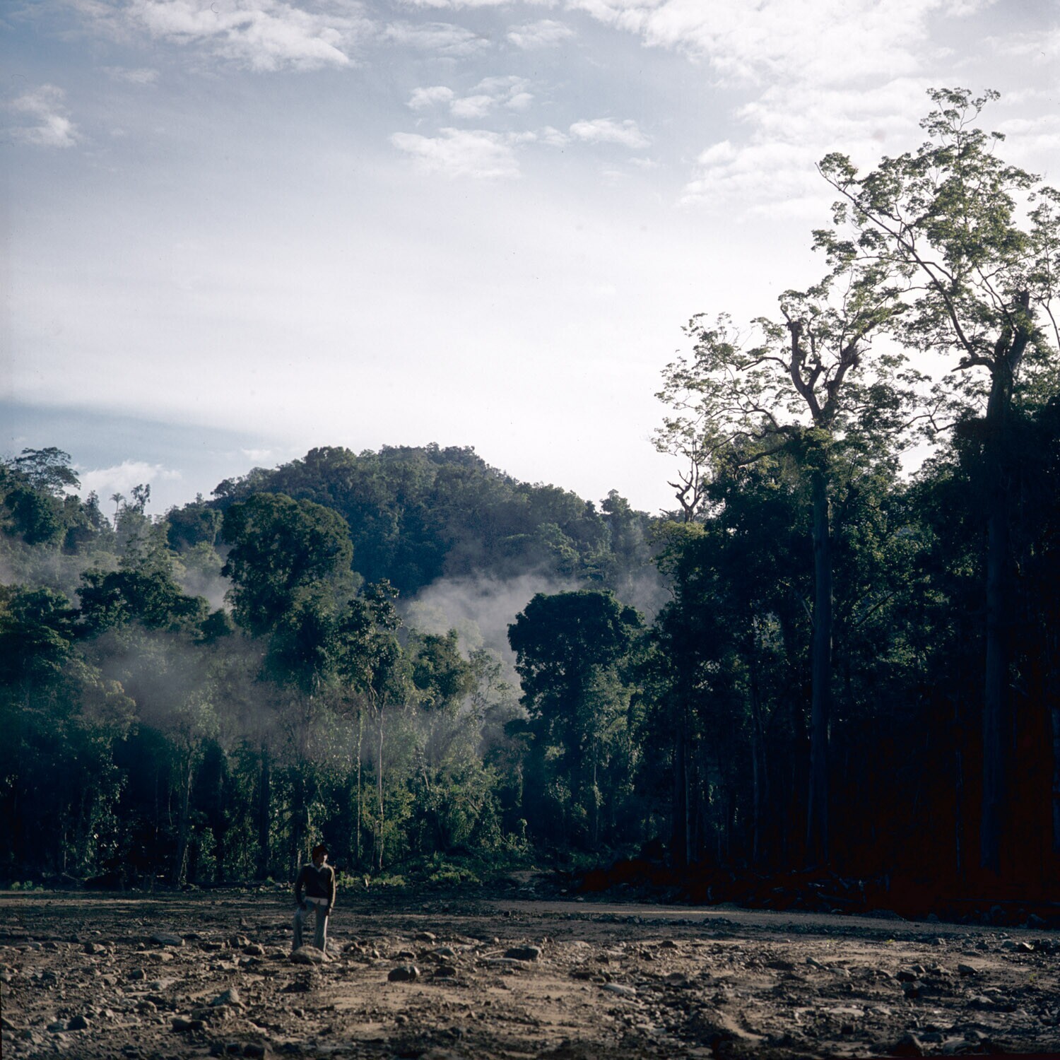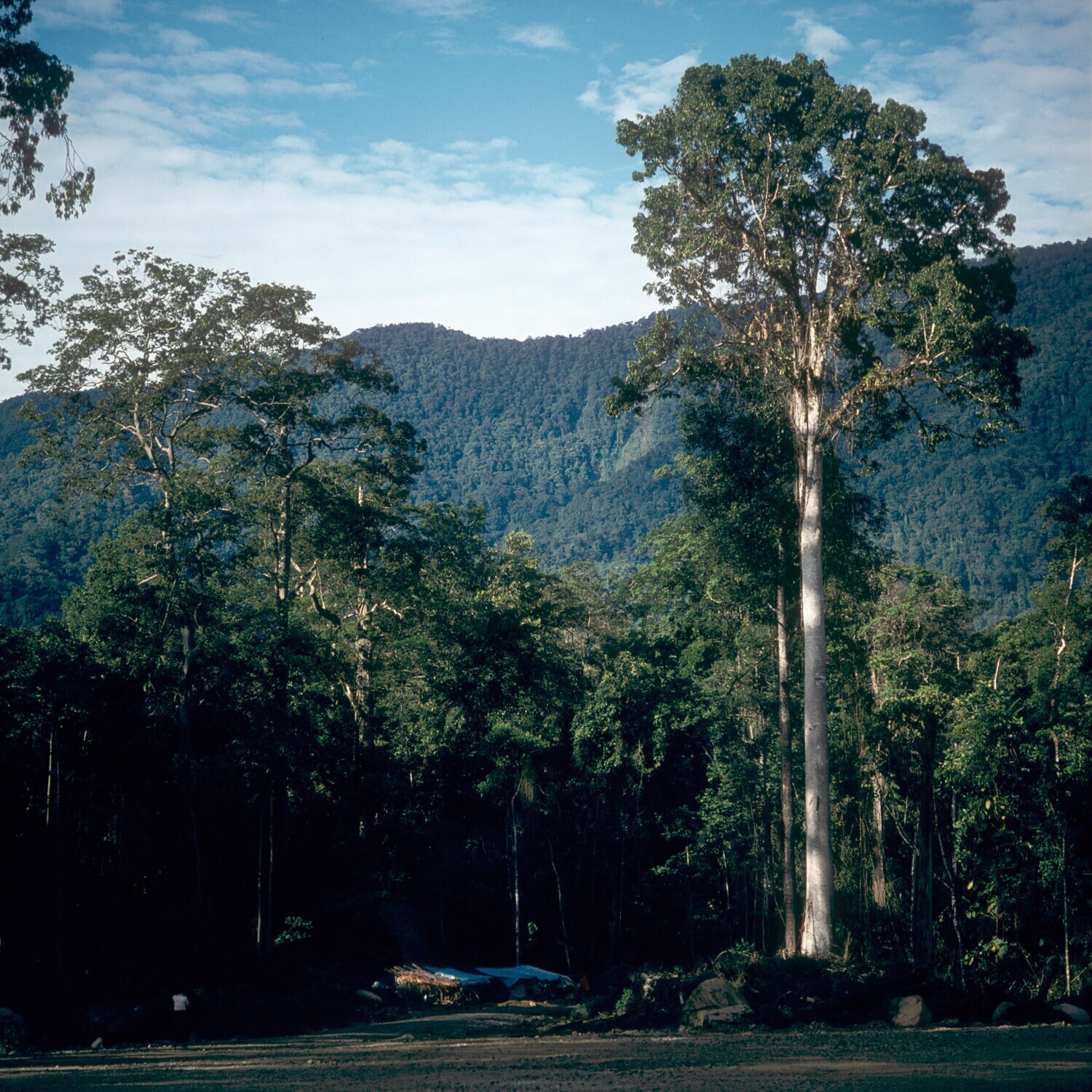 Ochtend in het regenwoud, met kampement in de verte,...
