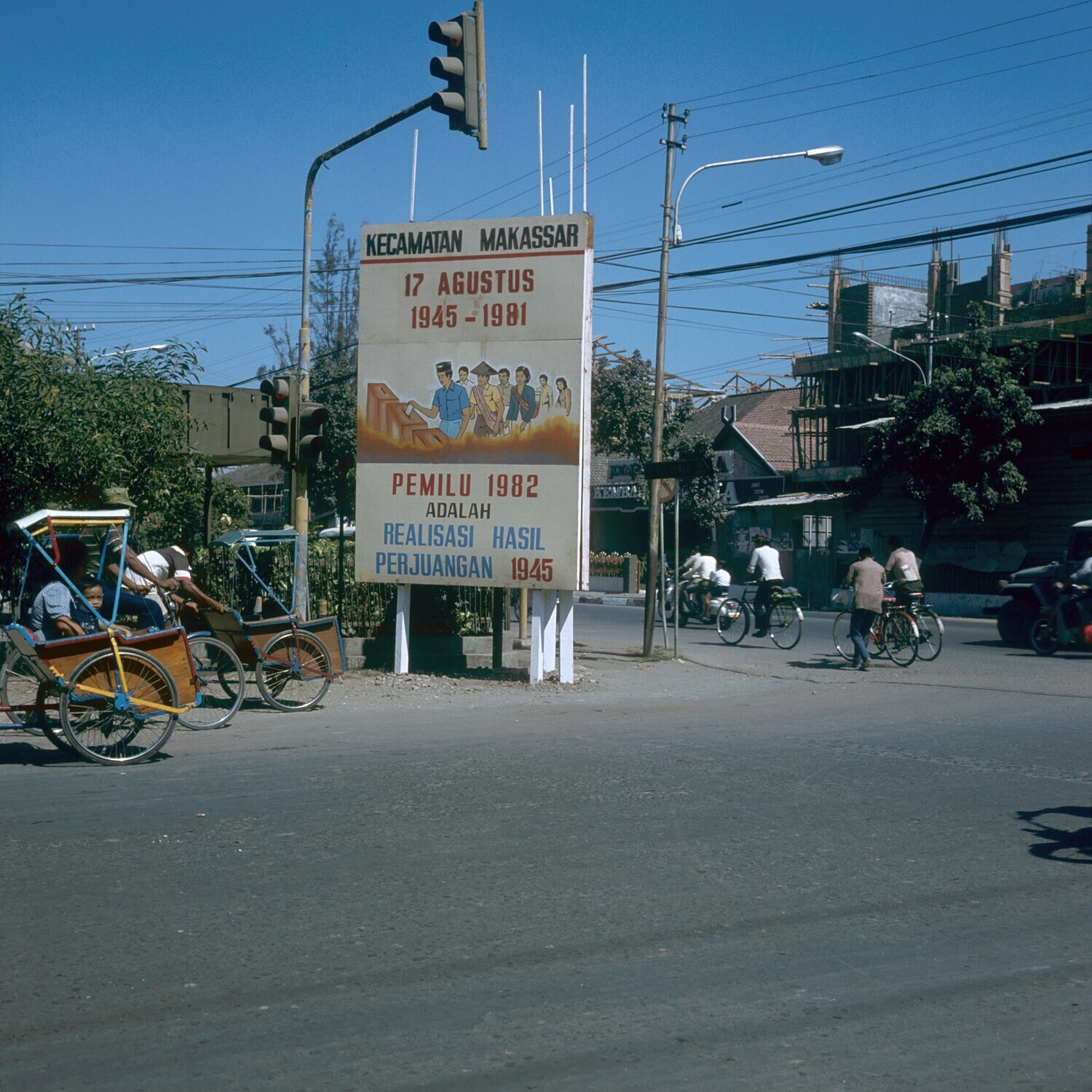 Op de achtergrond een verkiezingsbord, Ujung Pandang...