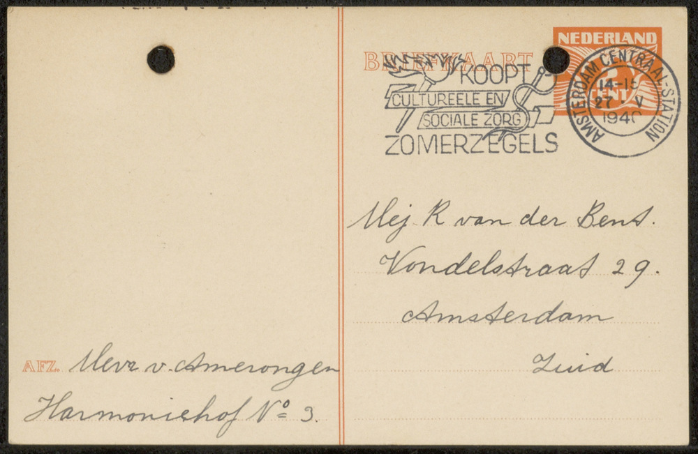 Briefkaart van Mevr. v. Amerongen 26 mei 1940