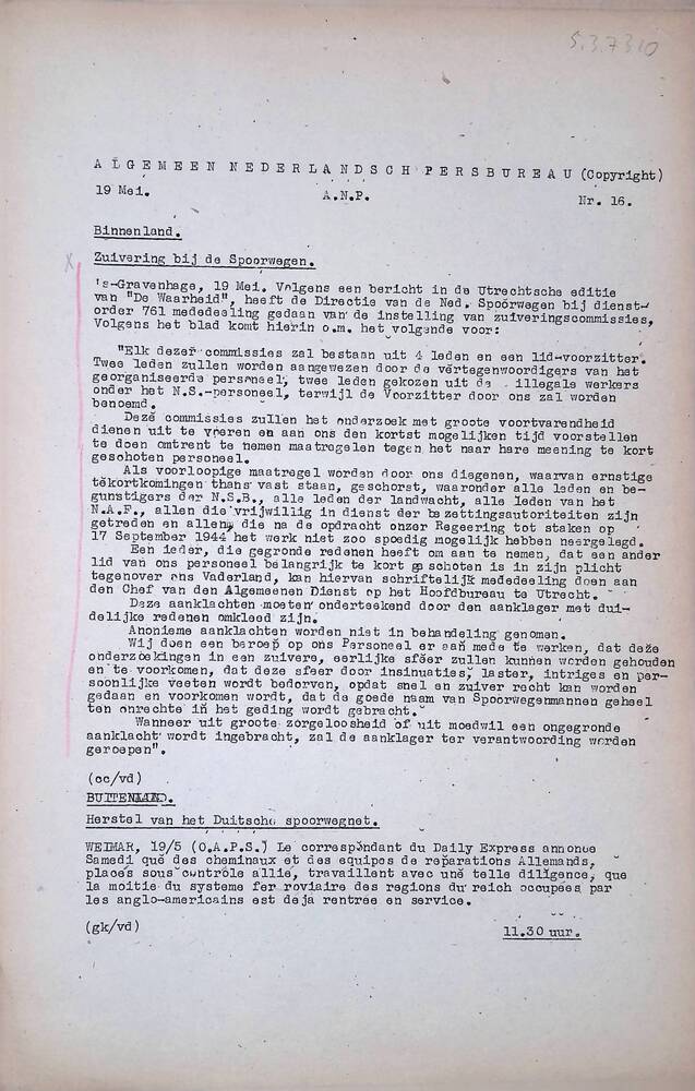 Algemeen Nederlandsch Persbureau, mededelingen, 19 m...