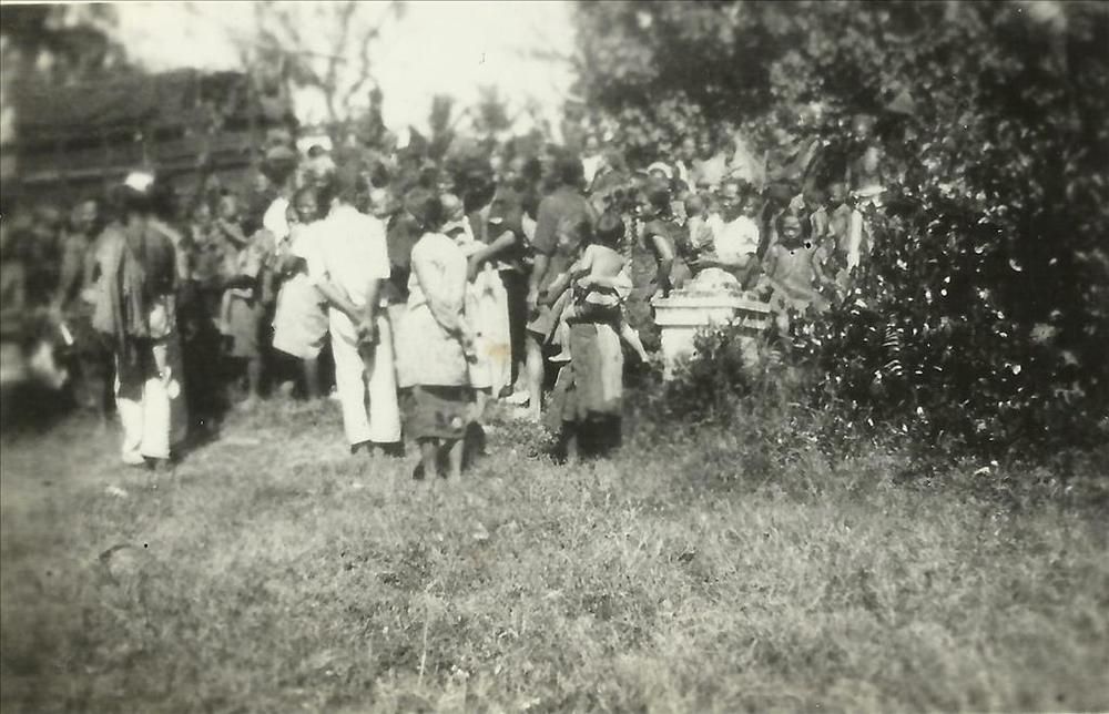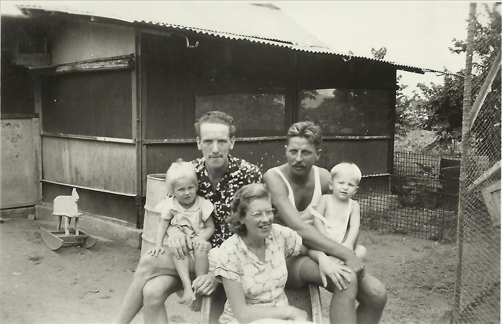 Nieuw-Guinea; gezin met vriend voor woongebouw