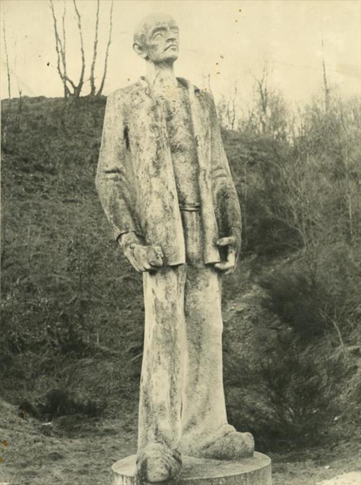 Foto van standbeeld van de gefusilleerde man kamp Am...