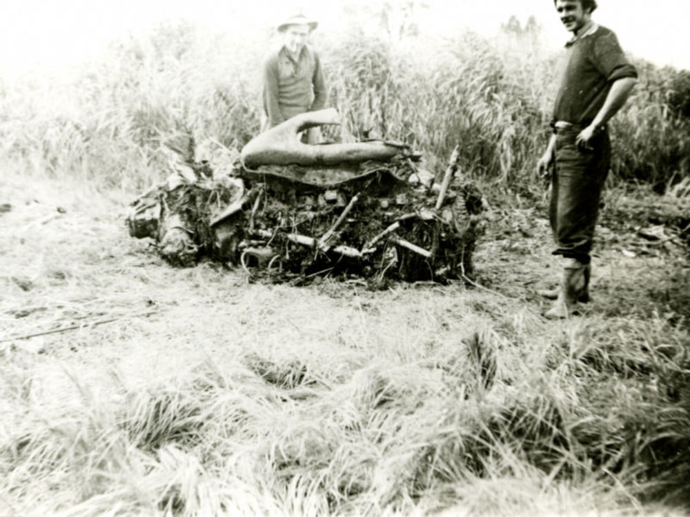 Foto van twee mannen bij vliegtuigmotor bij graanvel...