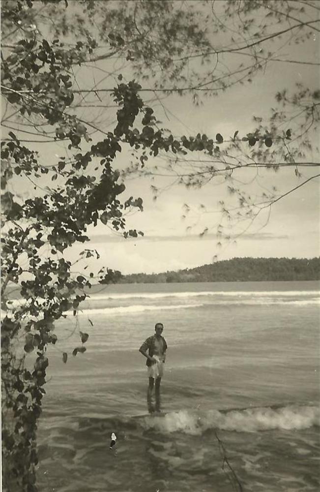 Nieuw-Guinea; witte man in korte broek in het water ...