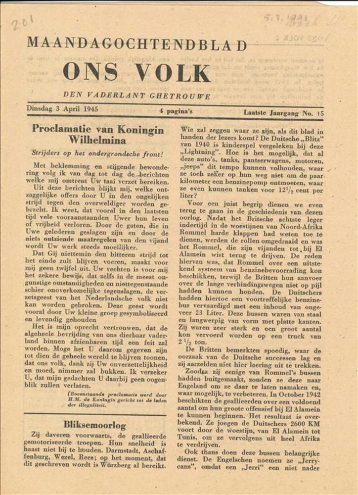 Maandagochtendblad "Ons Volk" Laatste Jaargang No 15...
