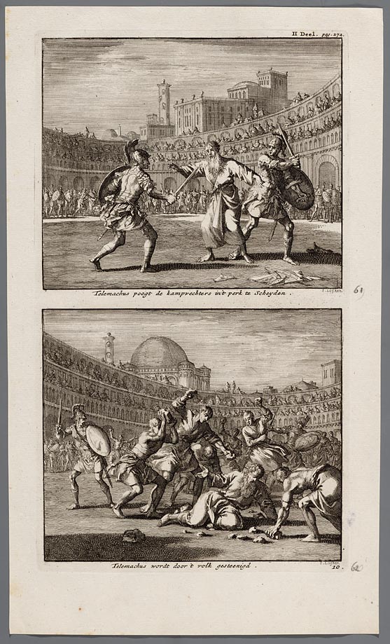 Telemachus poogt de kampvechters in ´t perk te schey...