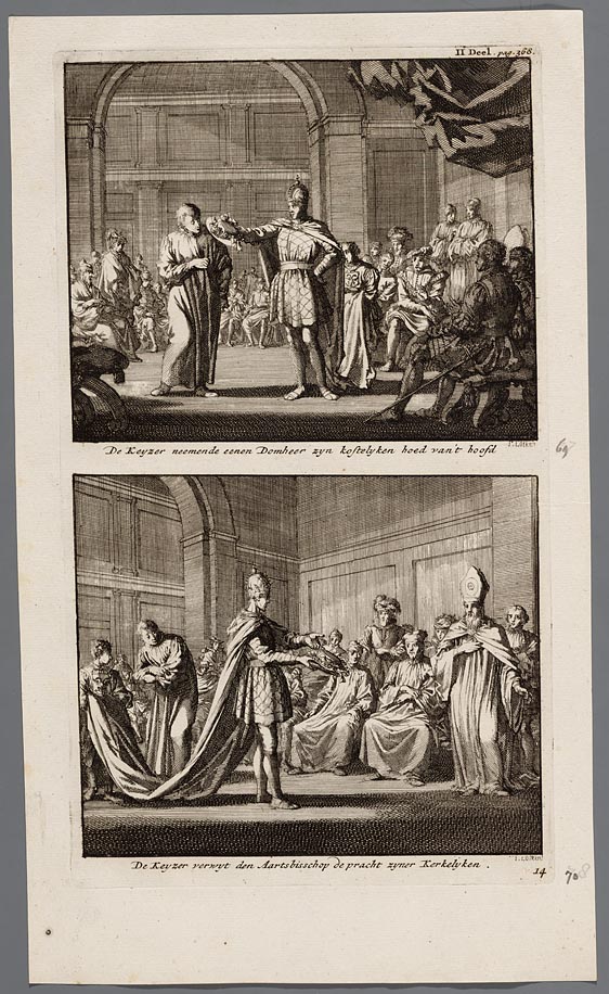 De keyzer neemende eenen domheer zyn kostelyken hoed...
