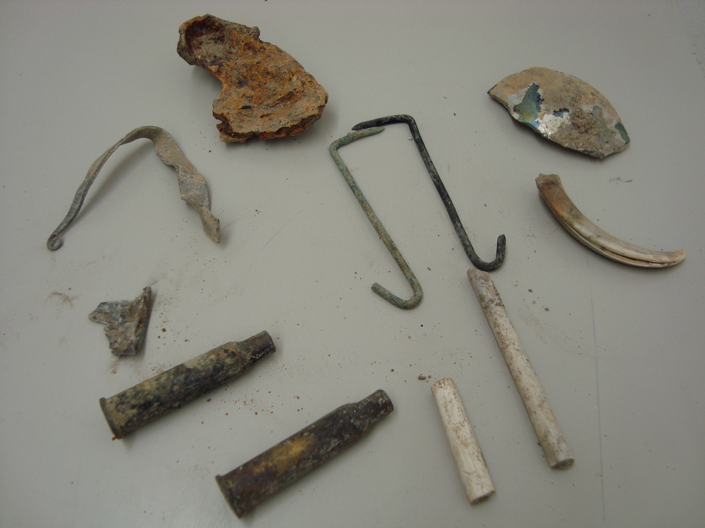 Vondstmateriaal, been/ijzer/aardewerk/steengoed,