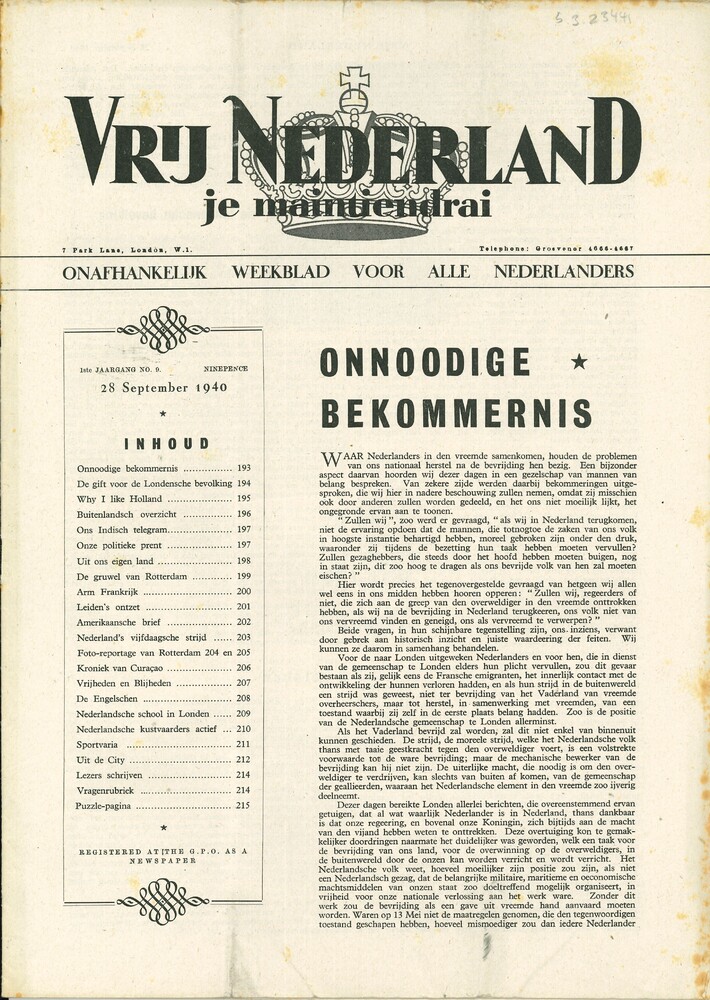 Vrij Nederland, gedrukt te Londen, 1ste jaarg. No 9,...