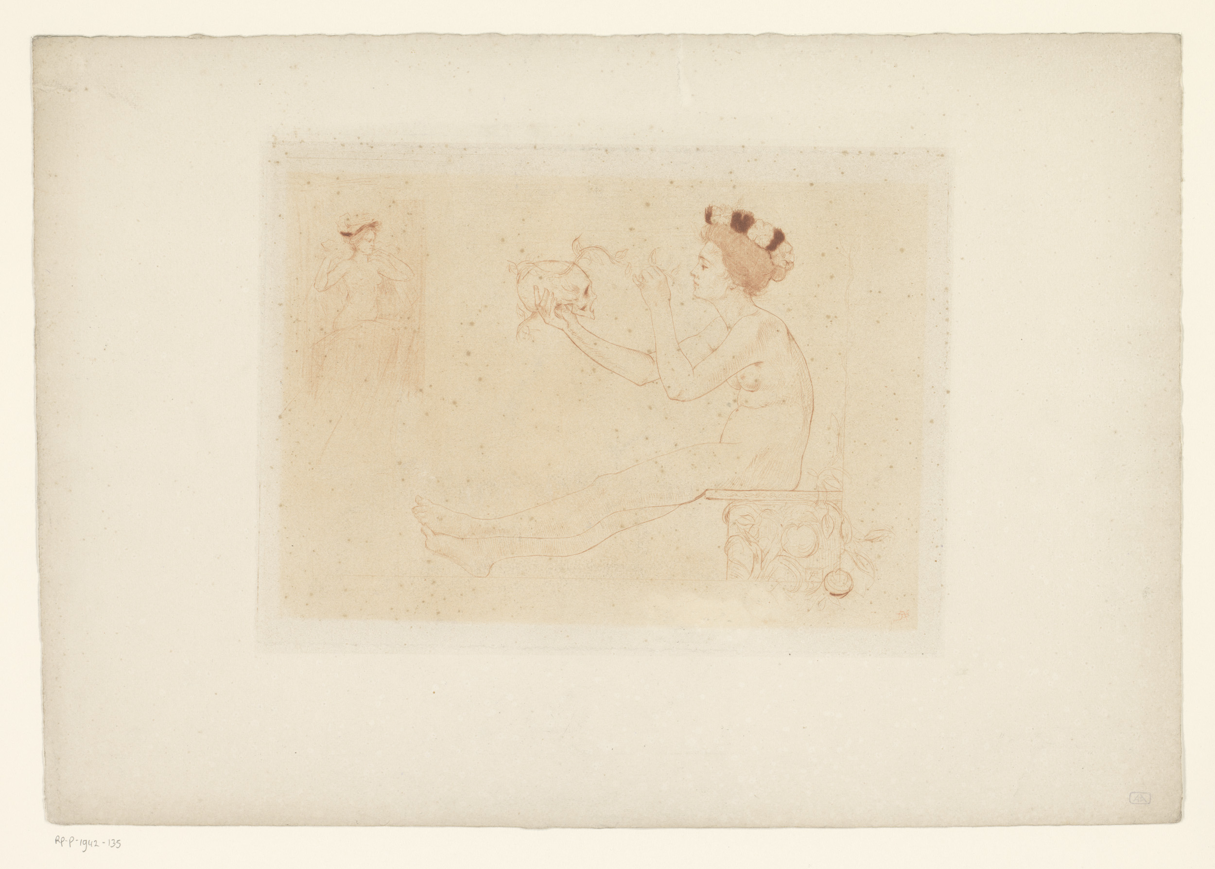 Naakte vrouw kijkt naar een schedel in haar hand