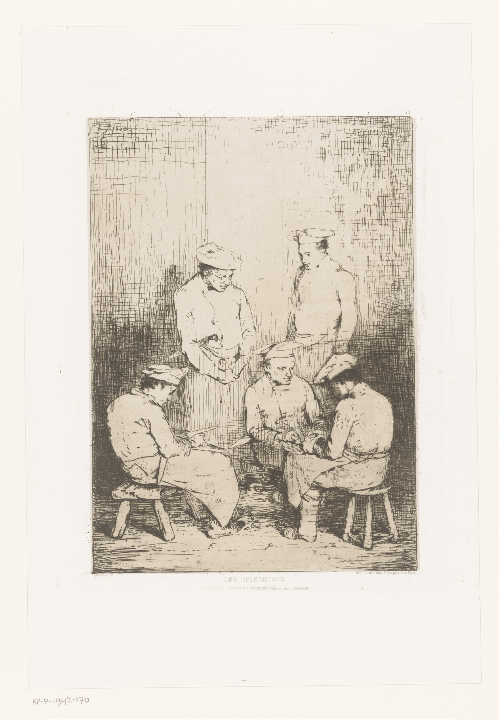 Groep van vijf koks, waarvan er drie zitten te schillen
