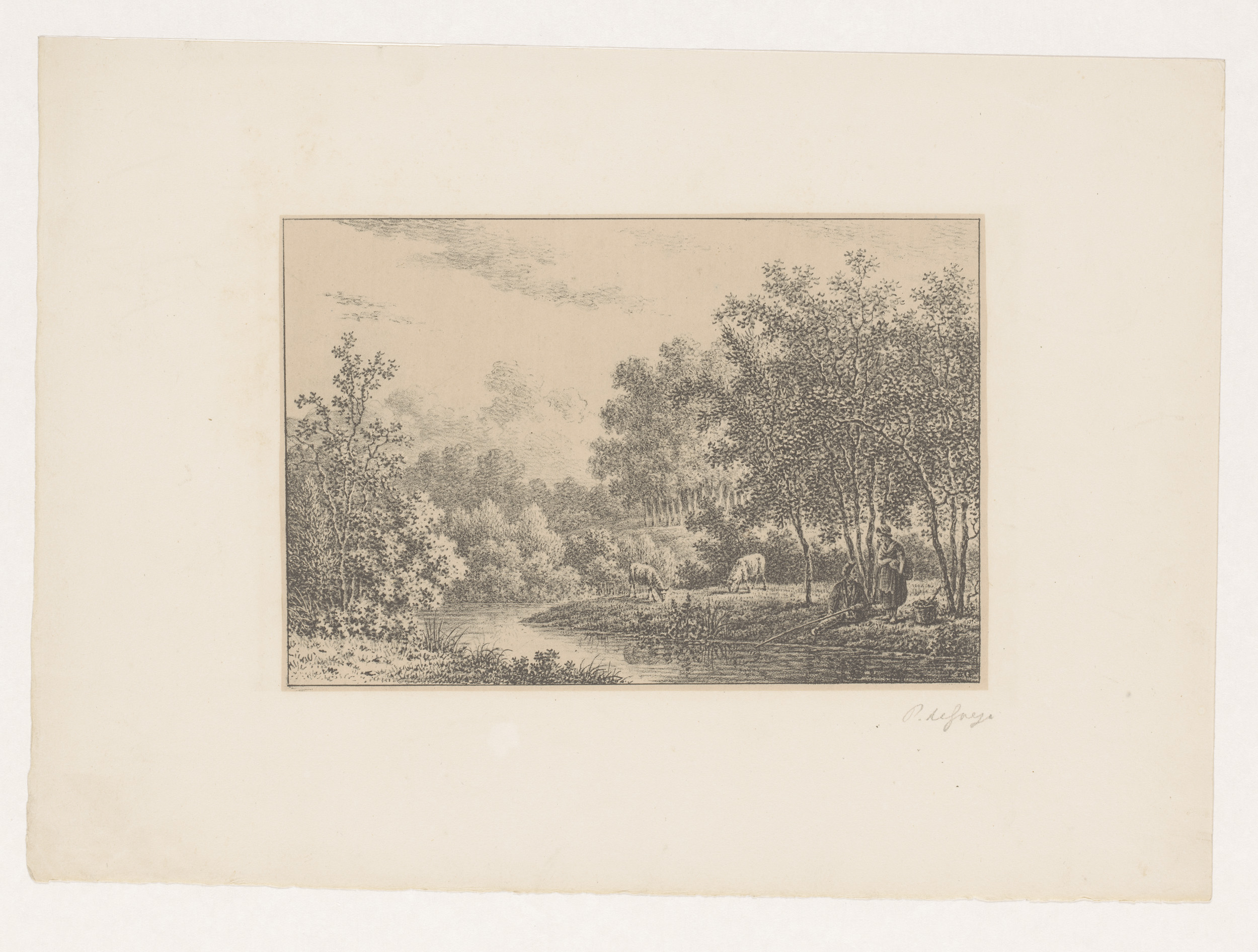 Landschap met rivier, visser en twee schapen