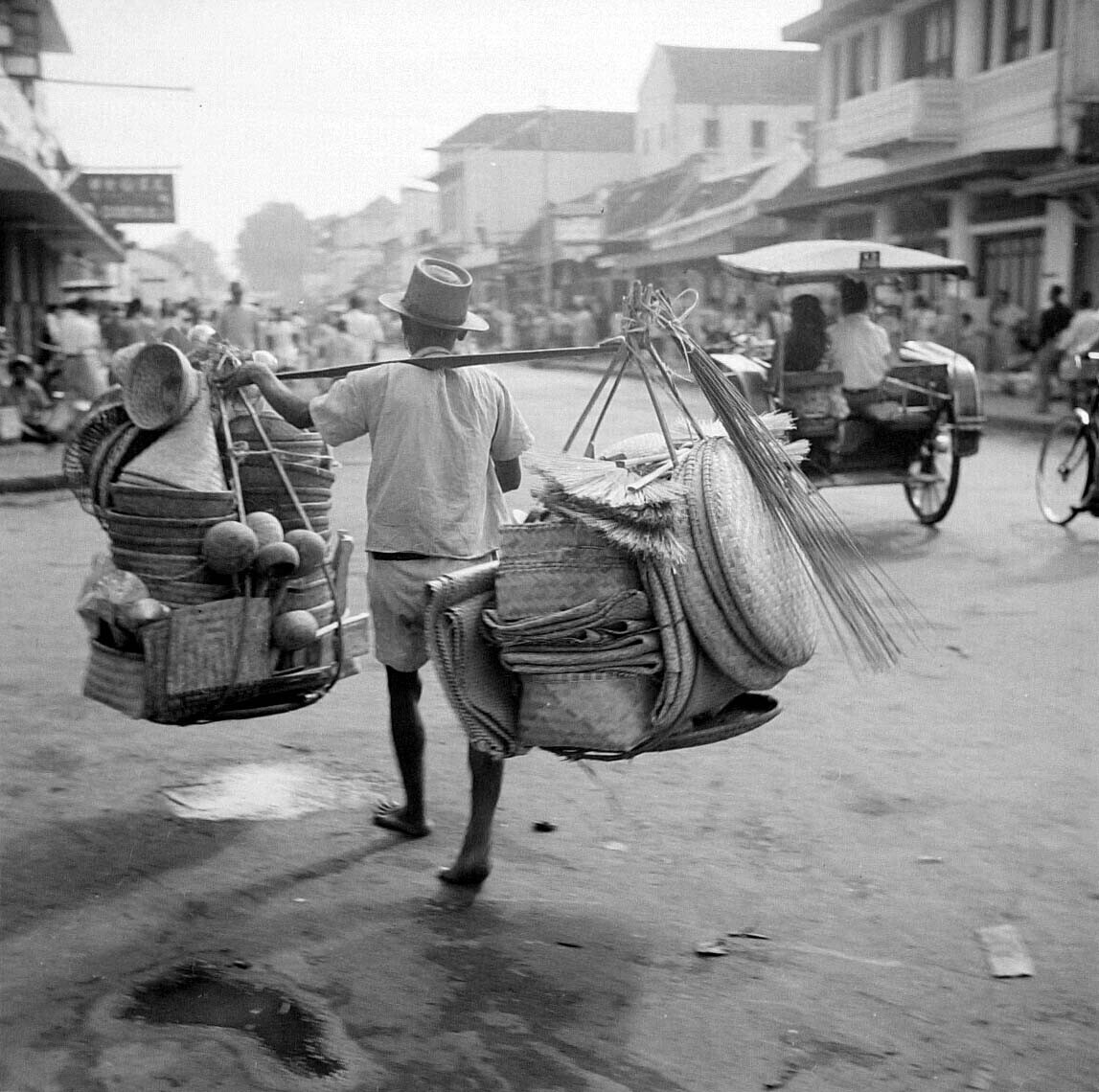 Een man verkoopt eten vanuit zijn draagbare restaura...