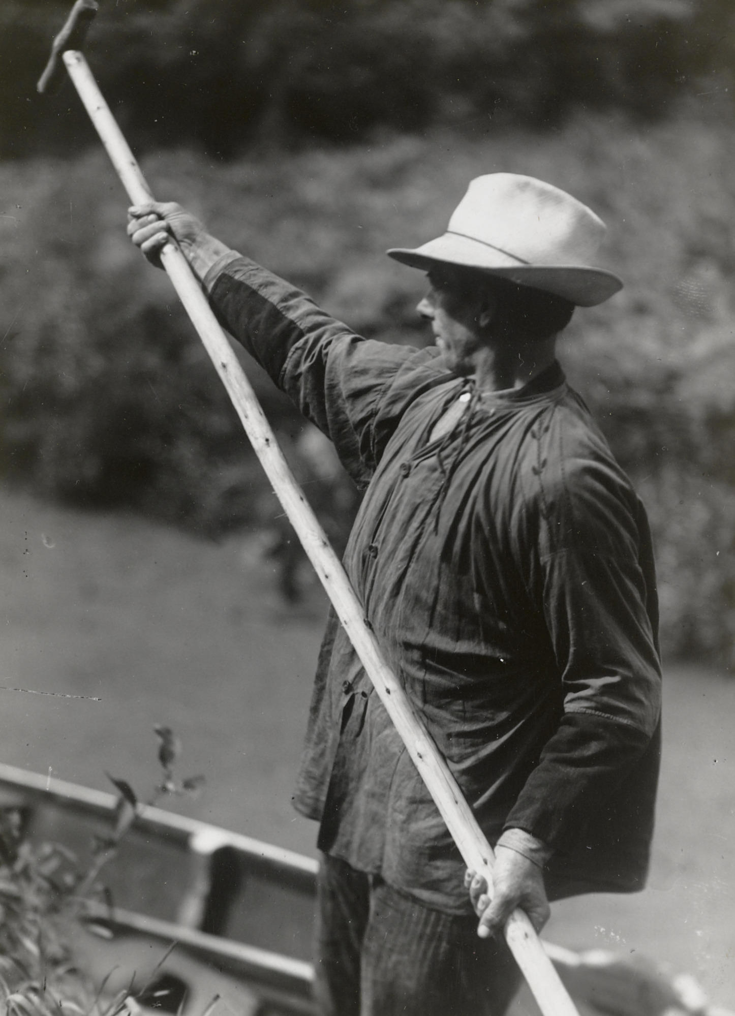 Man met vaarboom, Giethoorn, 1917 (zwart-wit foto)