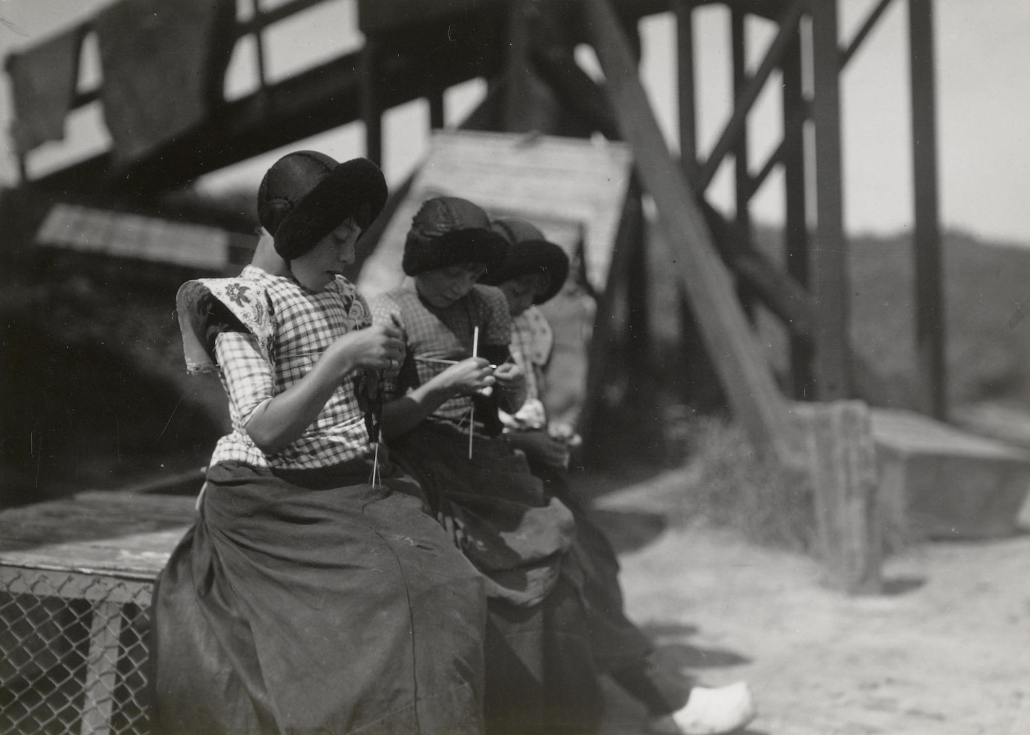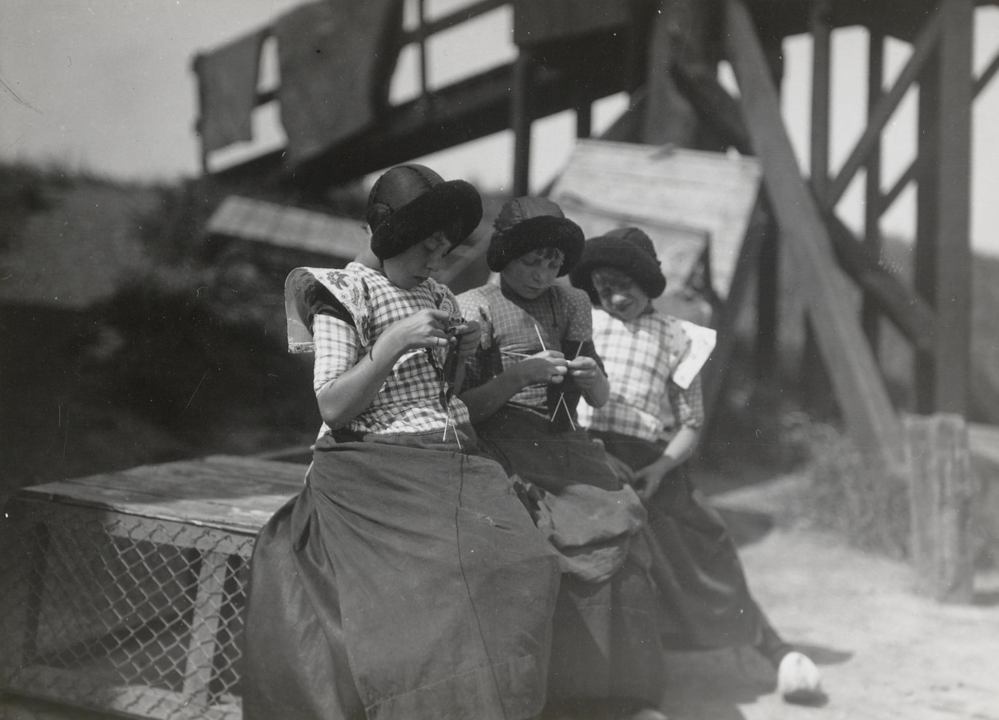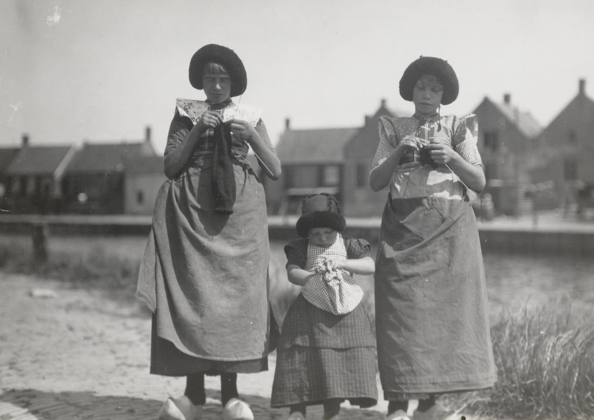 Breiende meisjes uit Spakenburg, 1927 (zwart-wit foto)