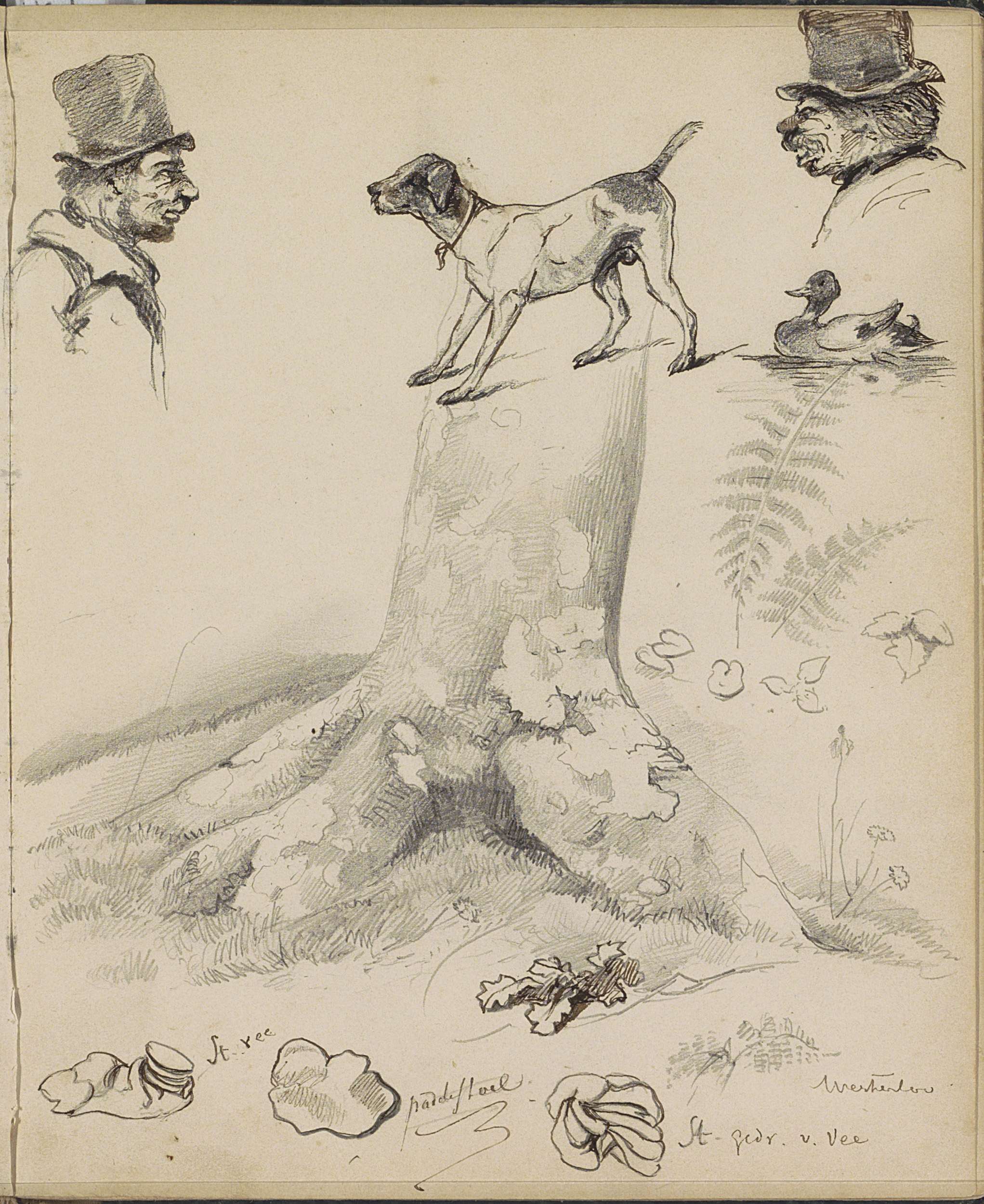 Boomstronk, mannenkoppen, een hond en een eend