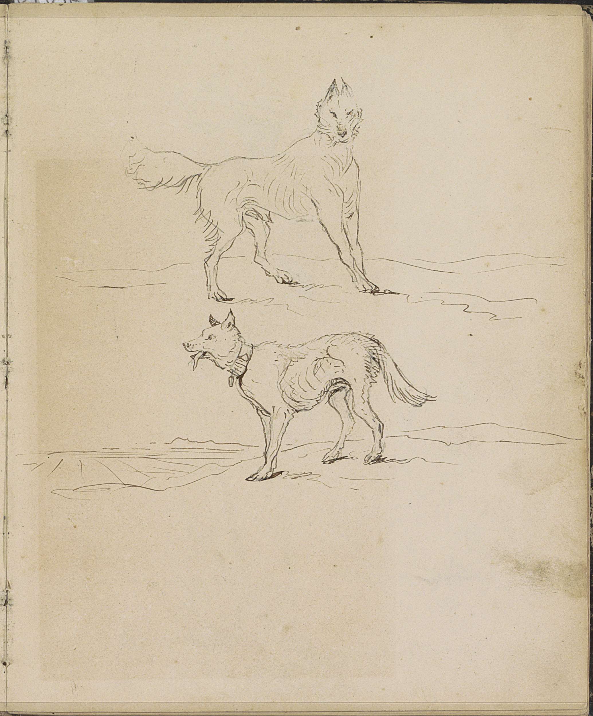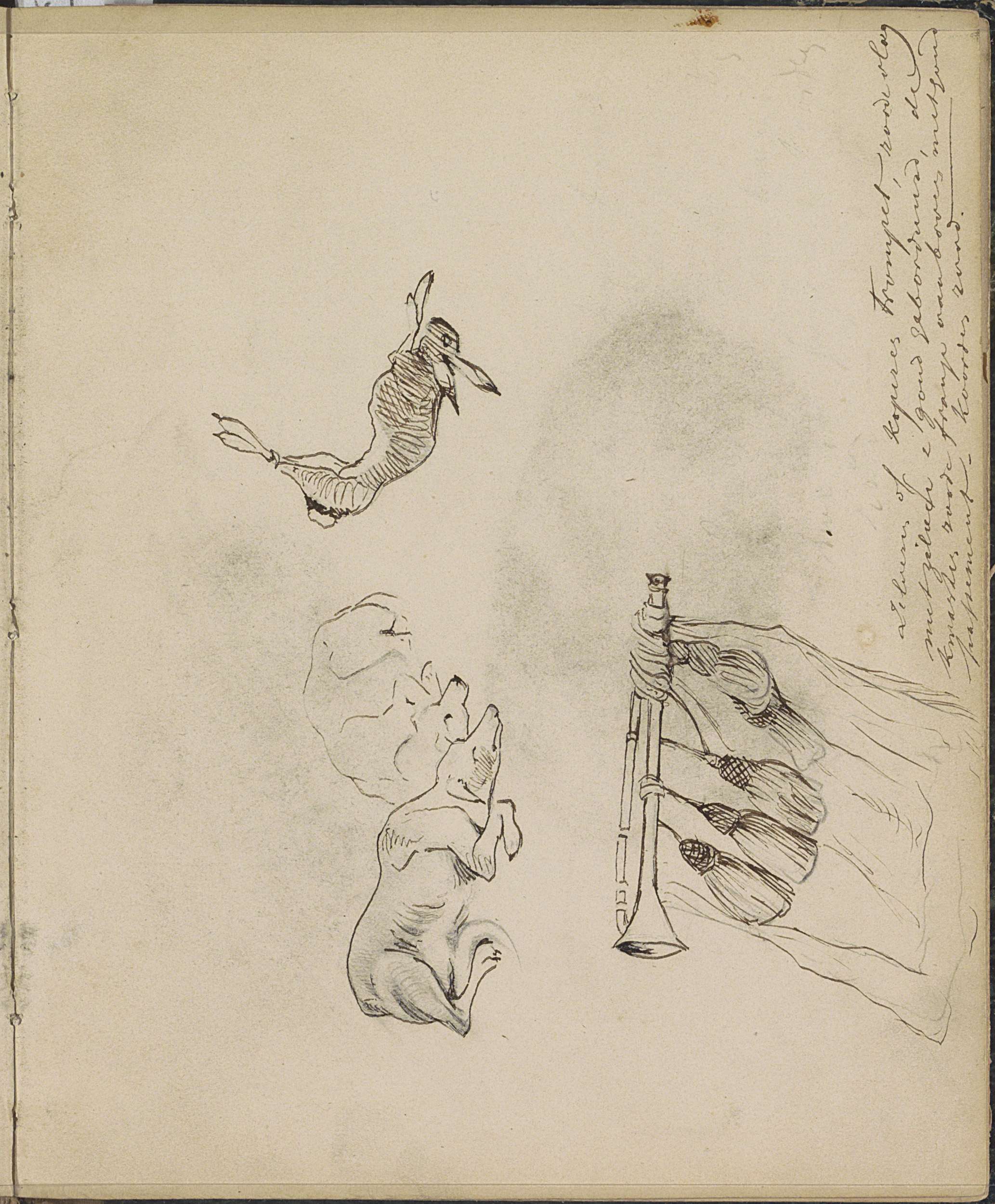 Trompet met een vlag, liggende honden en een hangend...