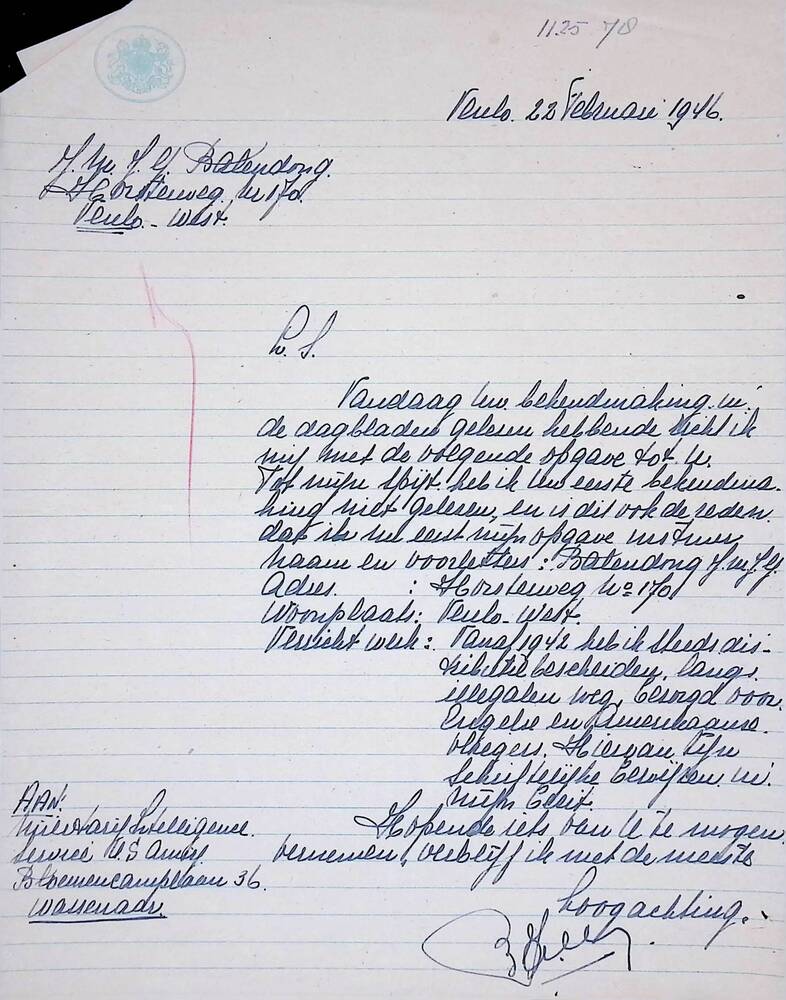 Brief betreffende de postume toekenning van het Eret...