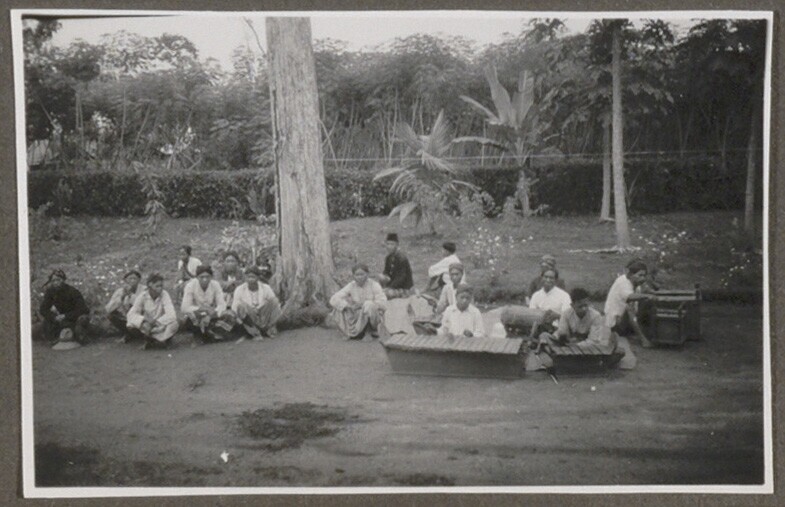 Groepsportret van een Javaans orkest in Trimujo