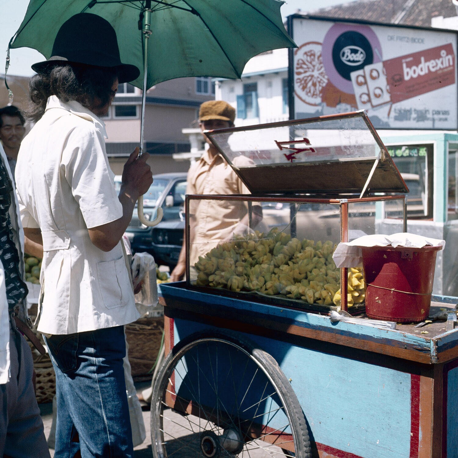 Rijdend fruitstalletje, verkoop van geschilde kedong...