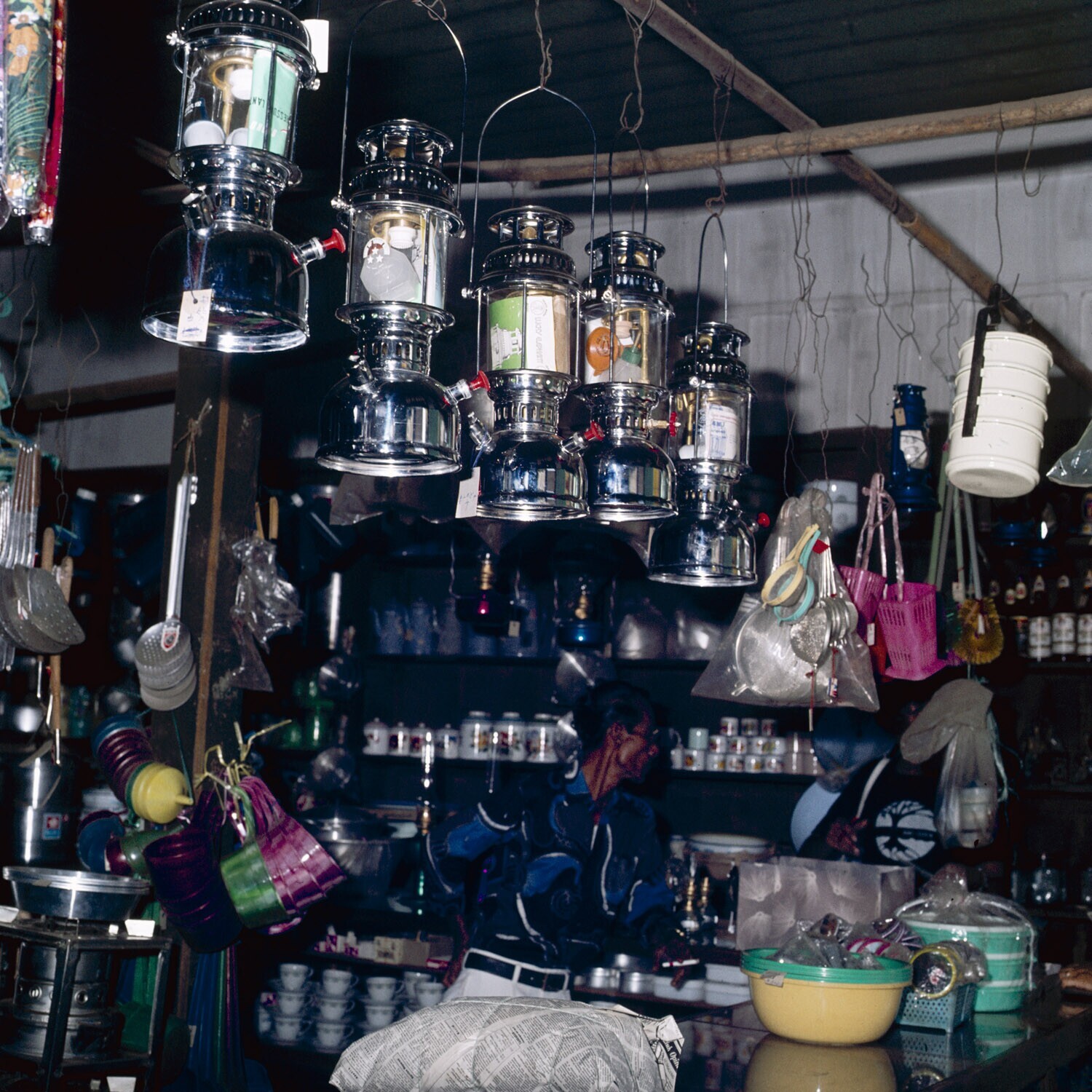 Pasar Purwakarta. Petroleumlampen in een winkel.
