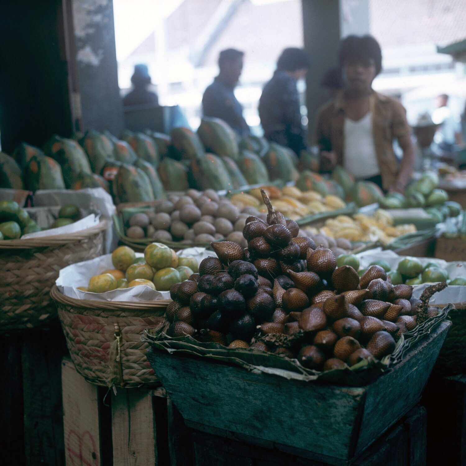 Pasar Purwakarta. Rijdende fruitstal met papaya en g...