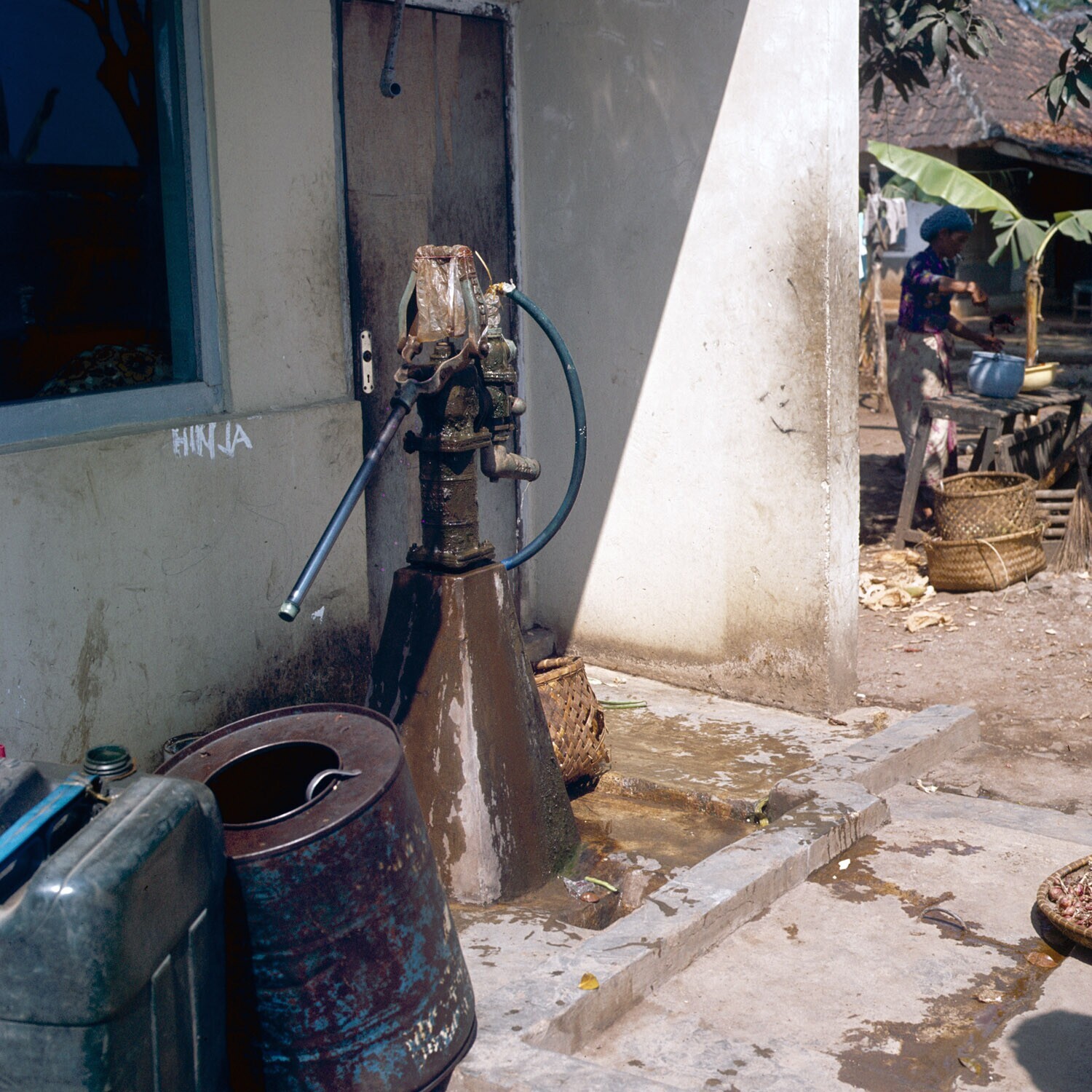 Een handwaterpomp bij en woning op de weg van Jakart...
