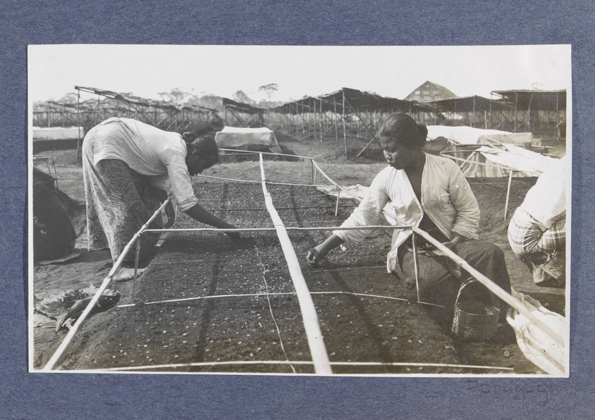 Vrouwen aan het werk bij zaadbedden op Sumatra