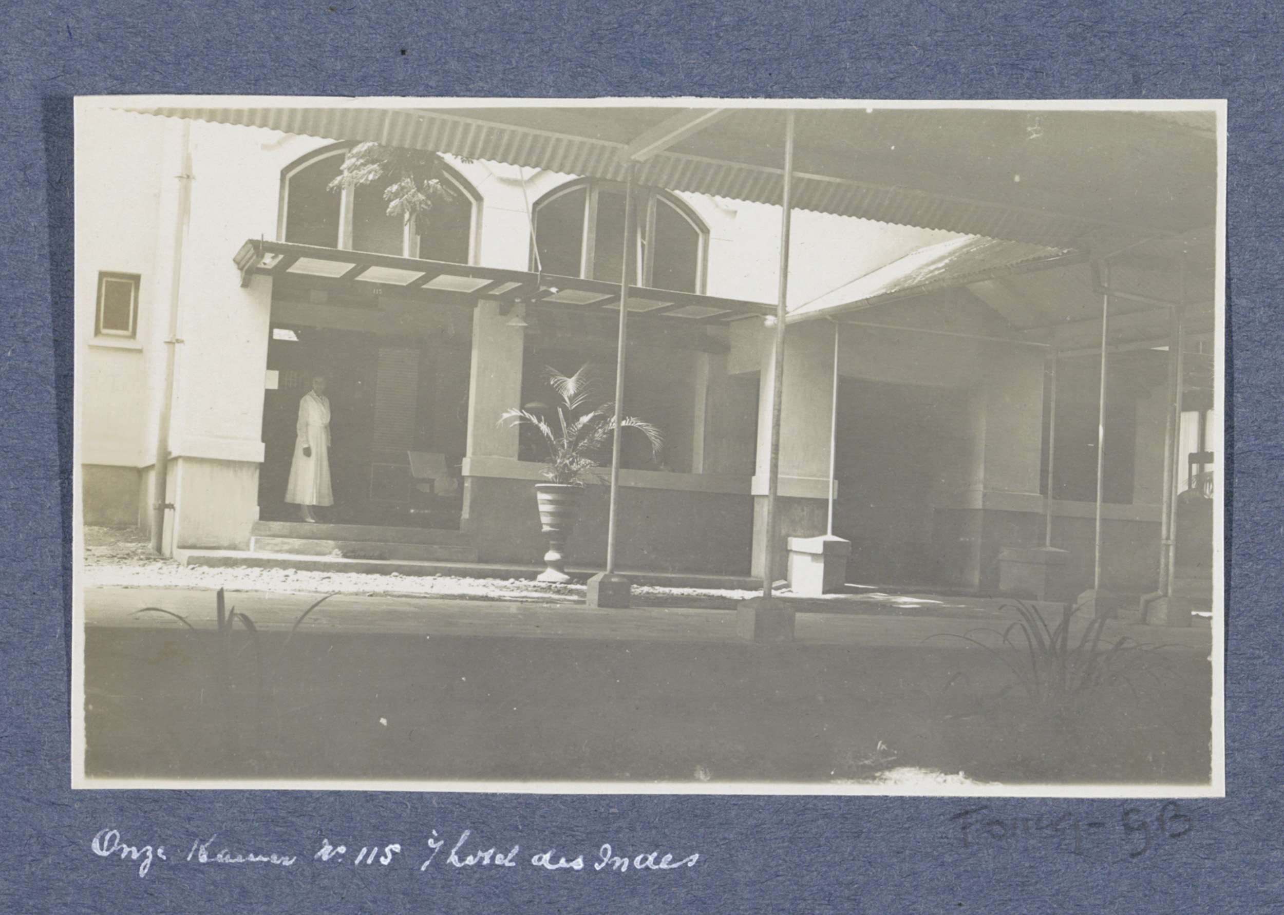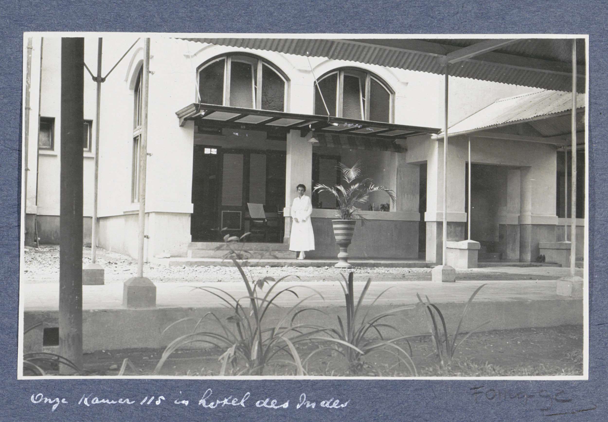 Vrouw staand bij kamer 115 van Hotel des Indes in Ba...