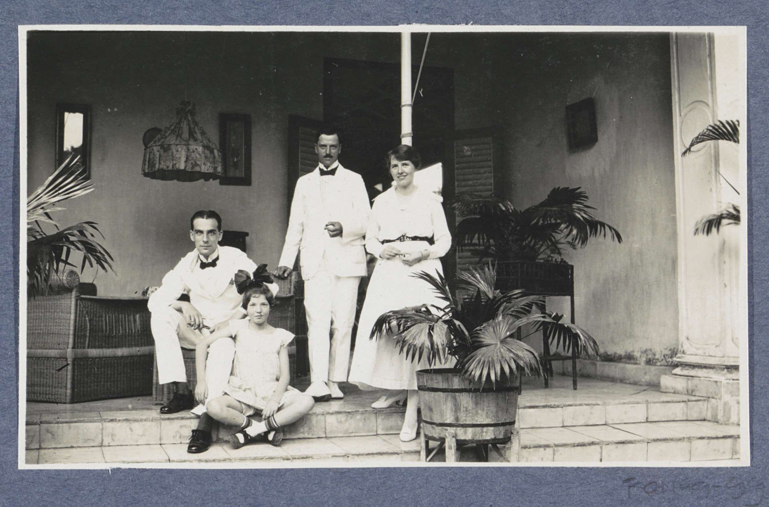 Twee mannen, een vrouw en een meisje poserend bij ee...