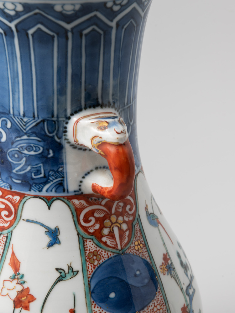 Peervormige vaas met decoratieve banden en bloeiende...