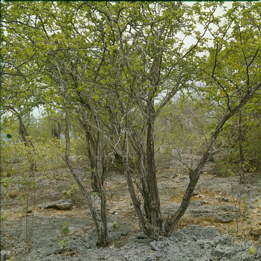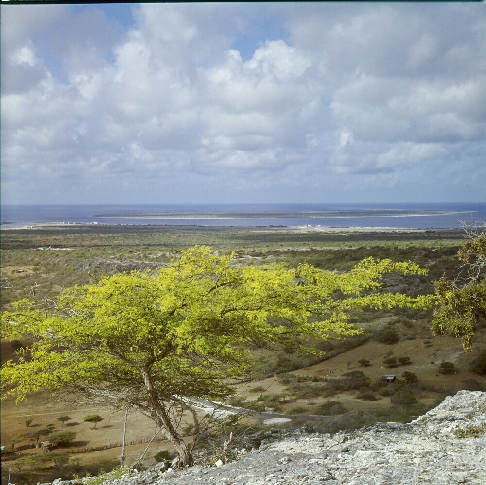 Woningen in Rincón, met op de voorgrond een boom