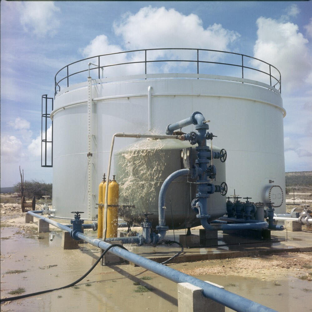 's Landswatervoorziening met olietank en op de voorg...