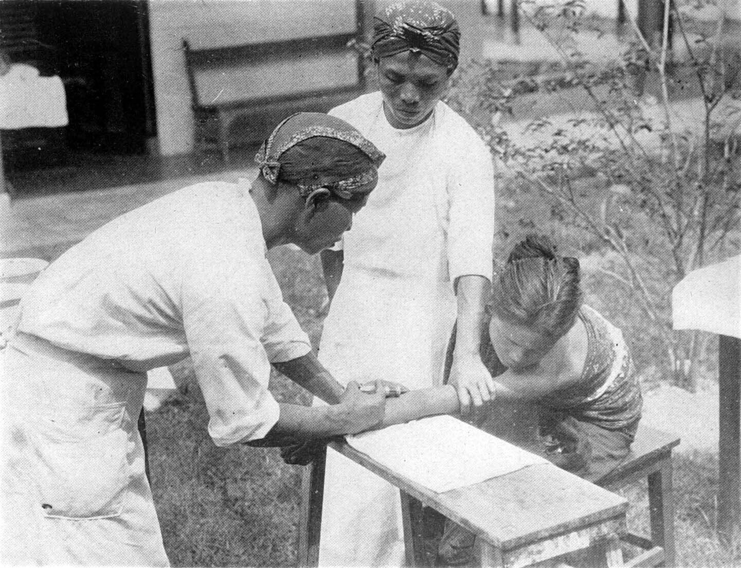 Een hoofdverpleger geeft een Salversaan-injectie in ...