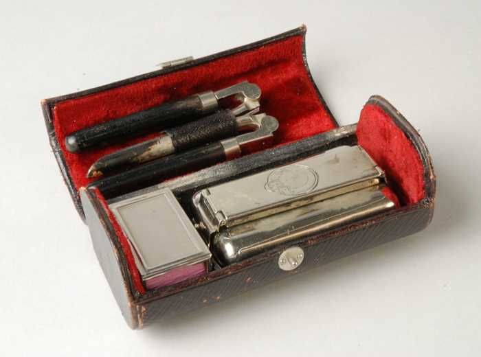 Krultang, spiritus komfoor en luciferhouder met luci...