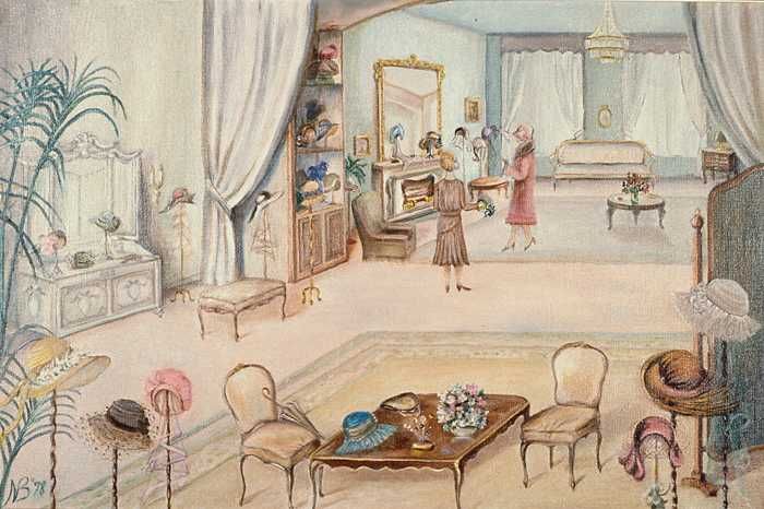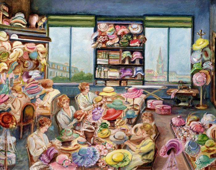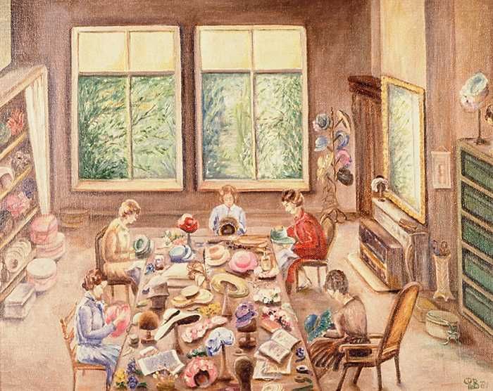 Hoedenatelier met zeven dames aan het werk