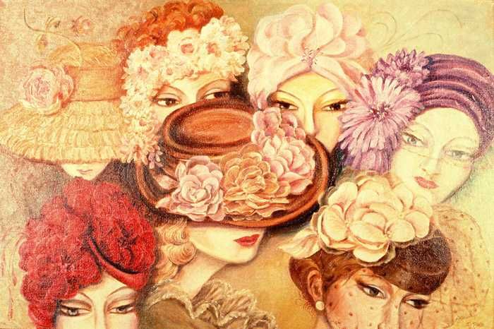 Compositie van onbekende dame omringd door hoeden