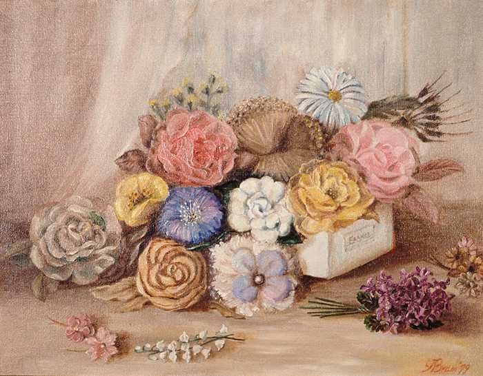 Compositie met bloemen en hoeden